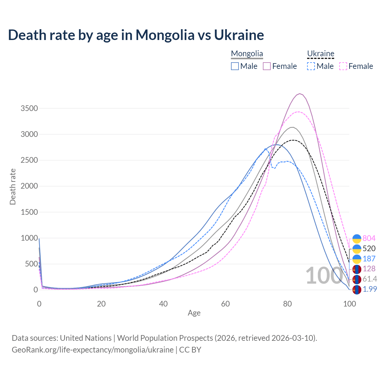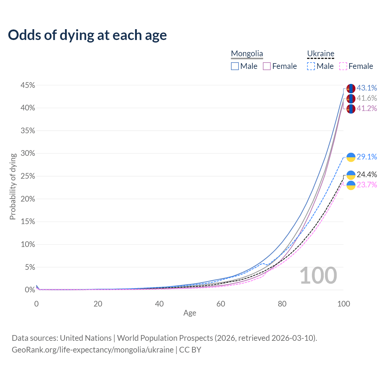 This life expectancy calculator shows the odds of living to 100, 95, 90, and below based on current age for both males and females in Mongolia and Ukraine, along with mean and median age of death. The calculations are based on the 2026 life tables (actuarial tables) from the UN World Population Prospects.
