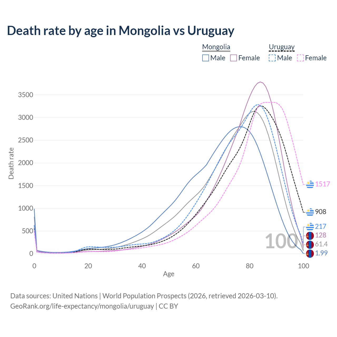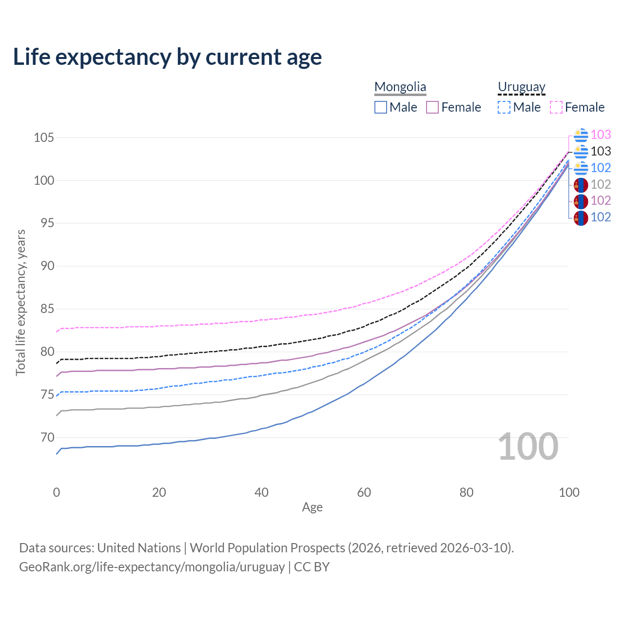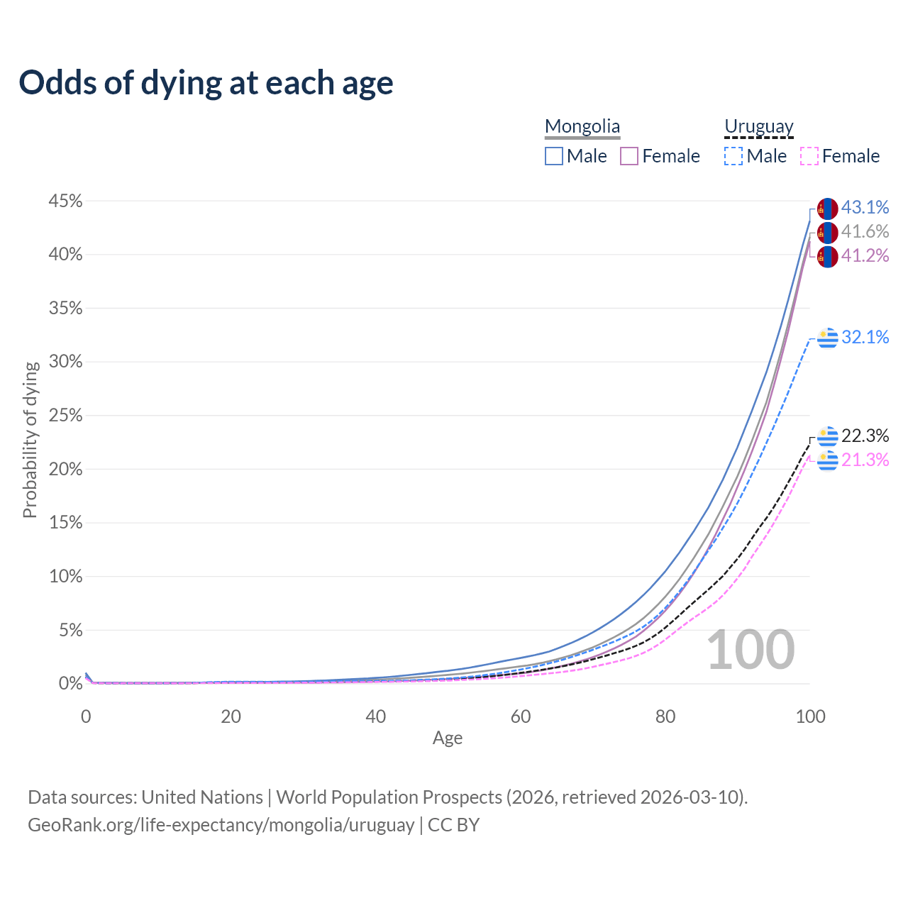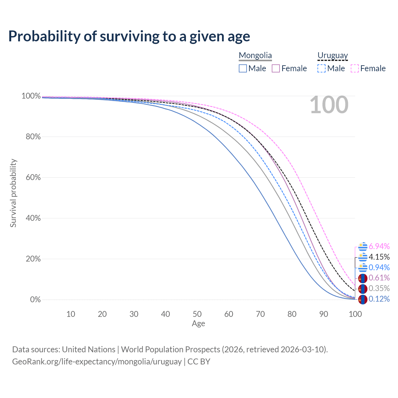 This life expectancy calculator shows the odds of living to 100, 95, 90, and below based on current age for both males and females in Mongolia and Uruguay, along with mean and median age of death. The calculations are based on the 2026 life tables (actuarial tables) from the UN World Population Prospects.
