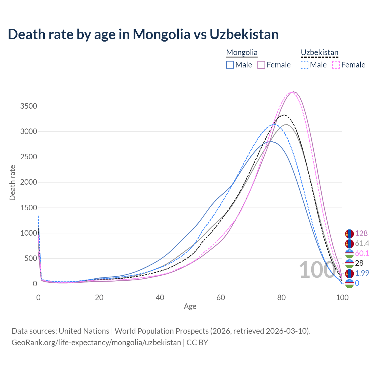 In Mongolia, the most common age of death is 82, compared to 81 in Uzbekistan. The median age of death is 76 in Mongolia and 76.4 in Uzbekistan, meaning only half of each cohort is expected to live past that age.