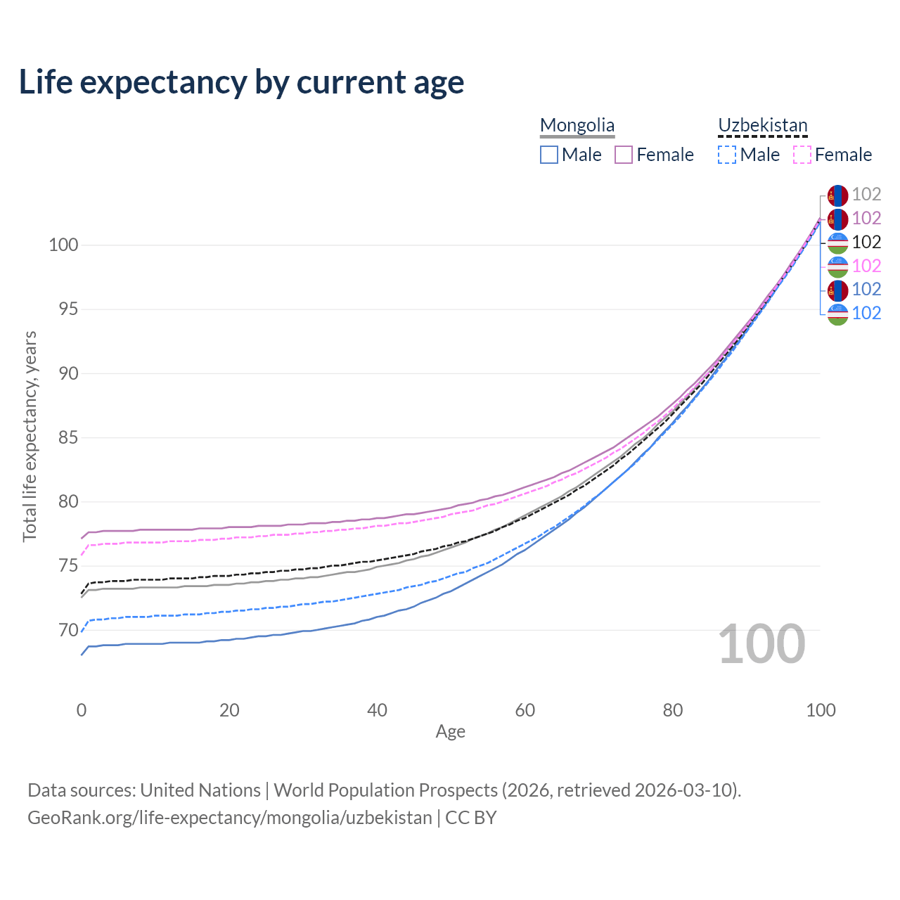 This life expectancy calculator shows the odds of living to 100, 95, 90, and below based on current age for both males and females in Mongolia and Uzbekistan, along with mean and median age of death. The calculations are based on the 2026 life tables (actuarial tables) from the UN World Population Prospects.