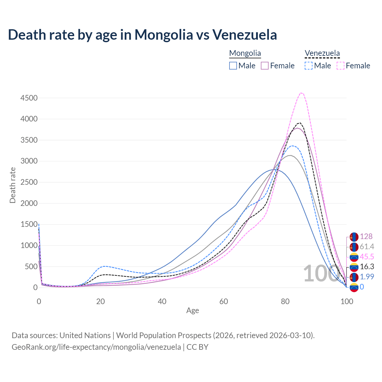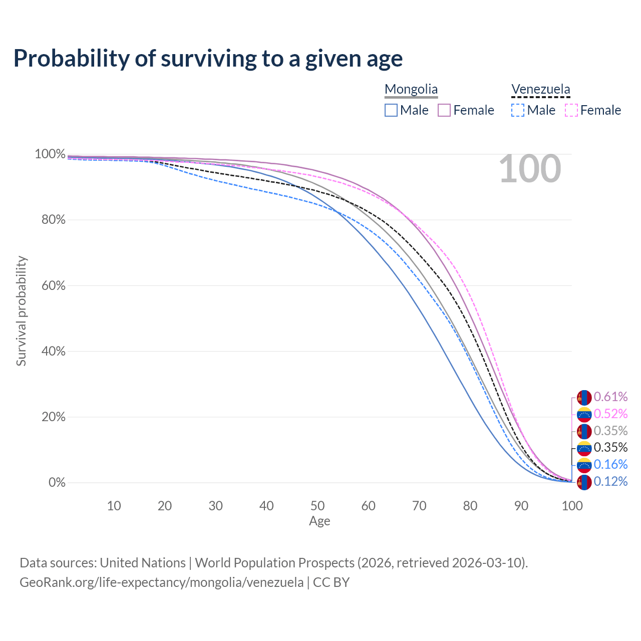This life expectancy calculator shows the odds of living to 100, 95, 90, and below based on current age for both males and females in Mongolia and Venezuela, along with mean and median age of death. The calculations are based on the 2026 life tables (actuarial tables) from the UN World Population Prospects.