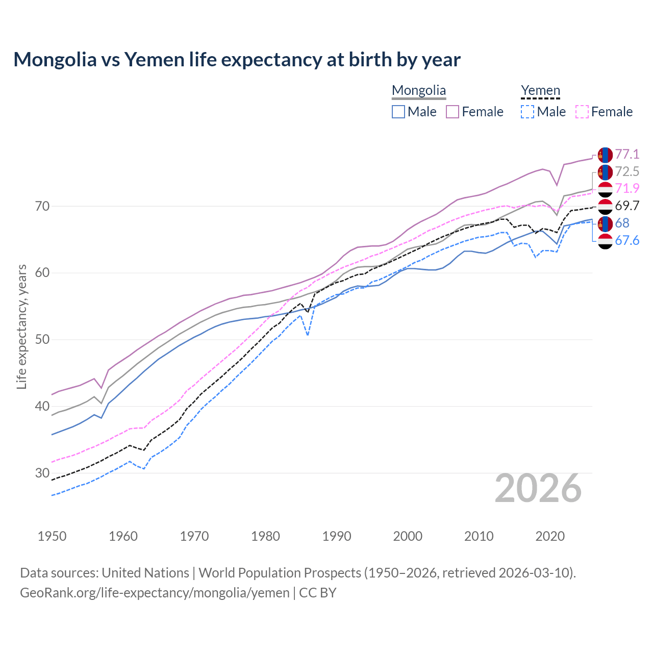 The average life expectancy at birth is 72.5 years in Mongolia vs 69.7 in Yemen. Mongolia is ranked 120/197 by life expectancy, and Yemen is 138/197. In Mongolia, the life expectancy is 68 years for males and 77.1 years for females. In Yemen, it's 67.6 years for males and 71.9 years for females.