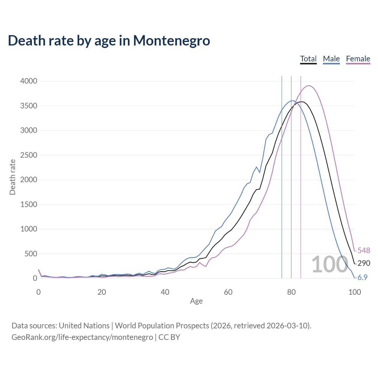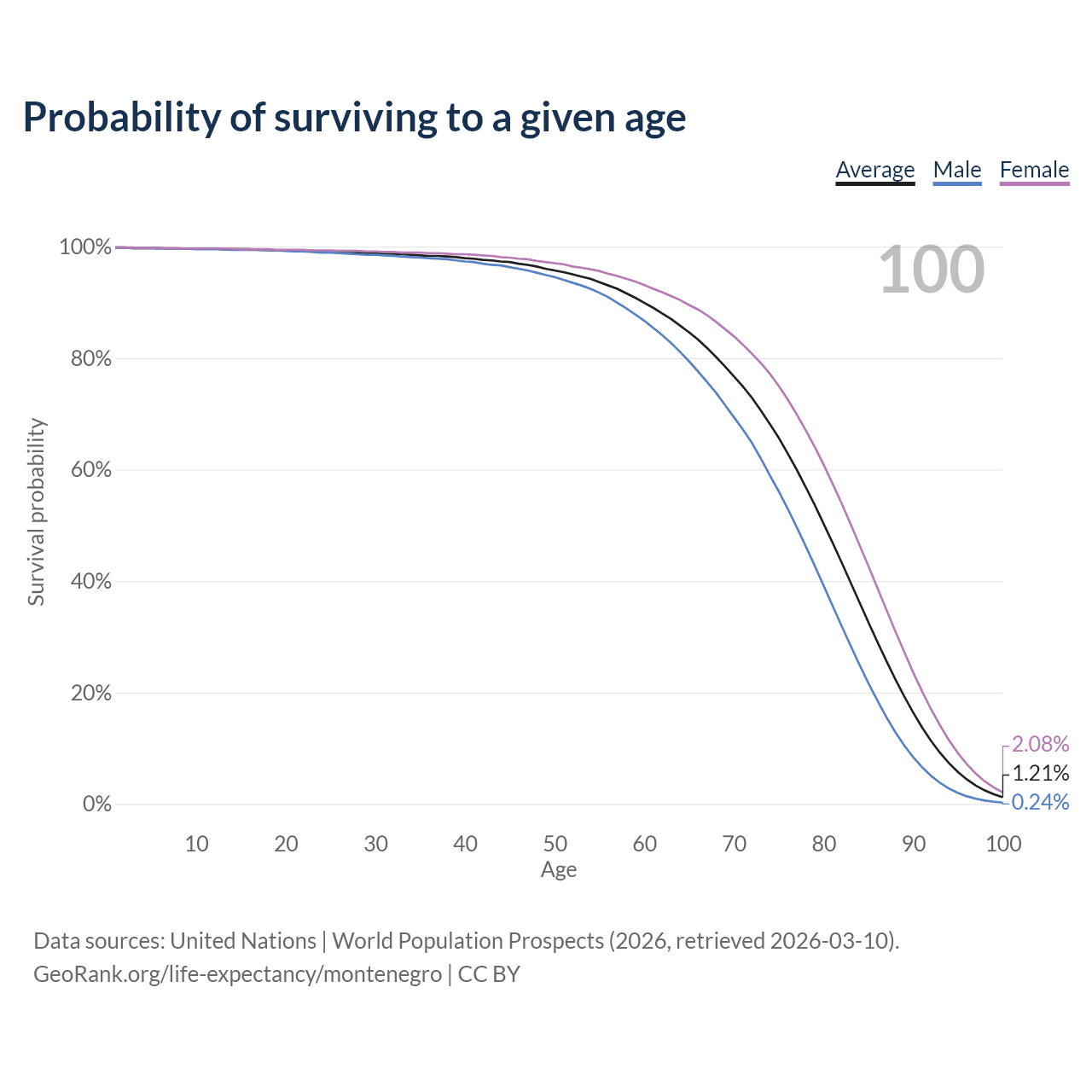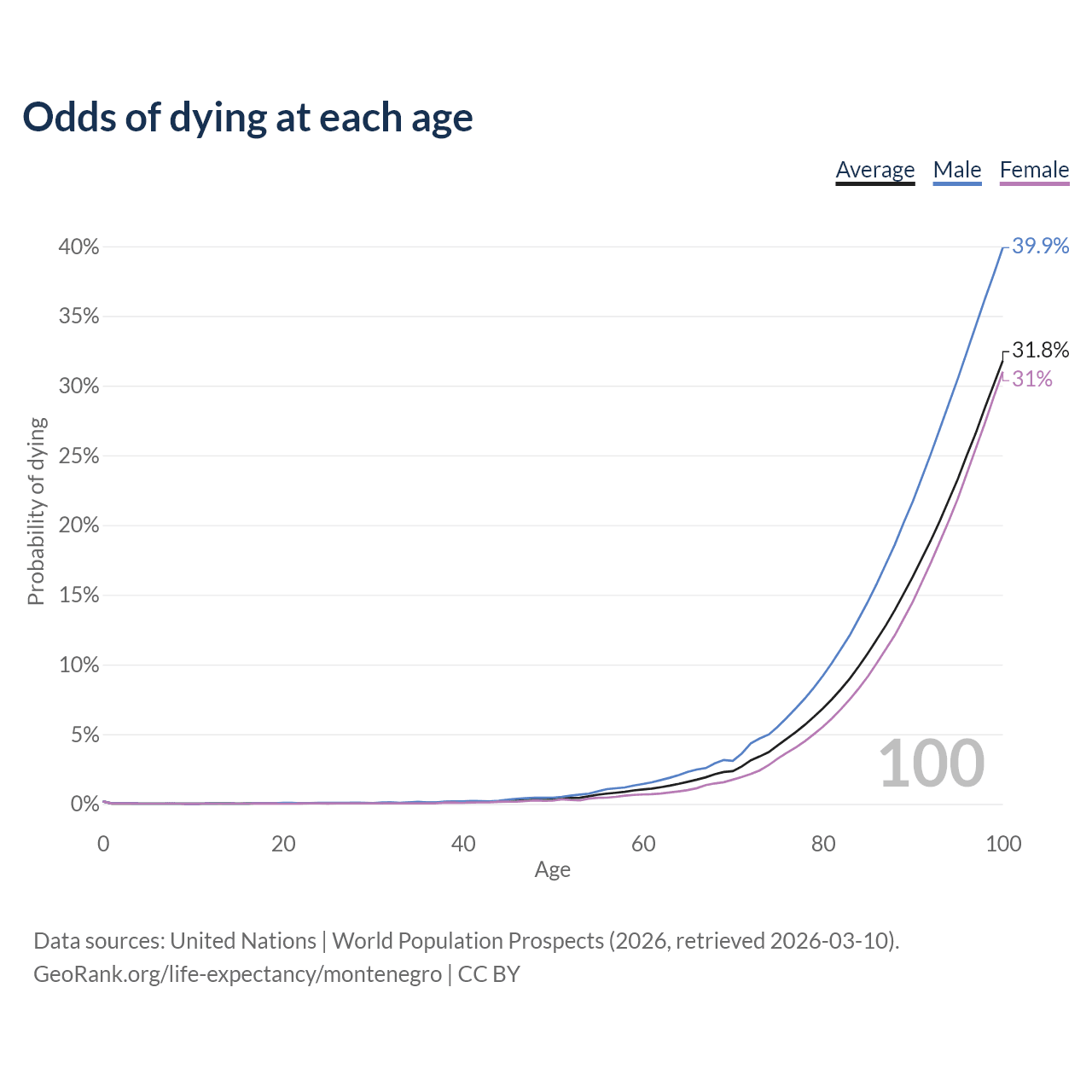 This life expectancy calculator shows the odds of living to 100, 95, 90, and below based on current age for both males and females in Montenegro, along with mean and median age of death. The calculations are based on the 2026 life tables (actuarial tables) from the UN World Population Prospects.