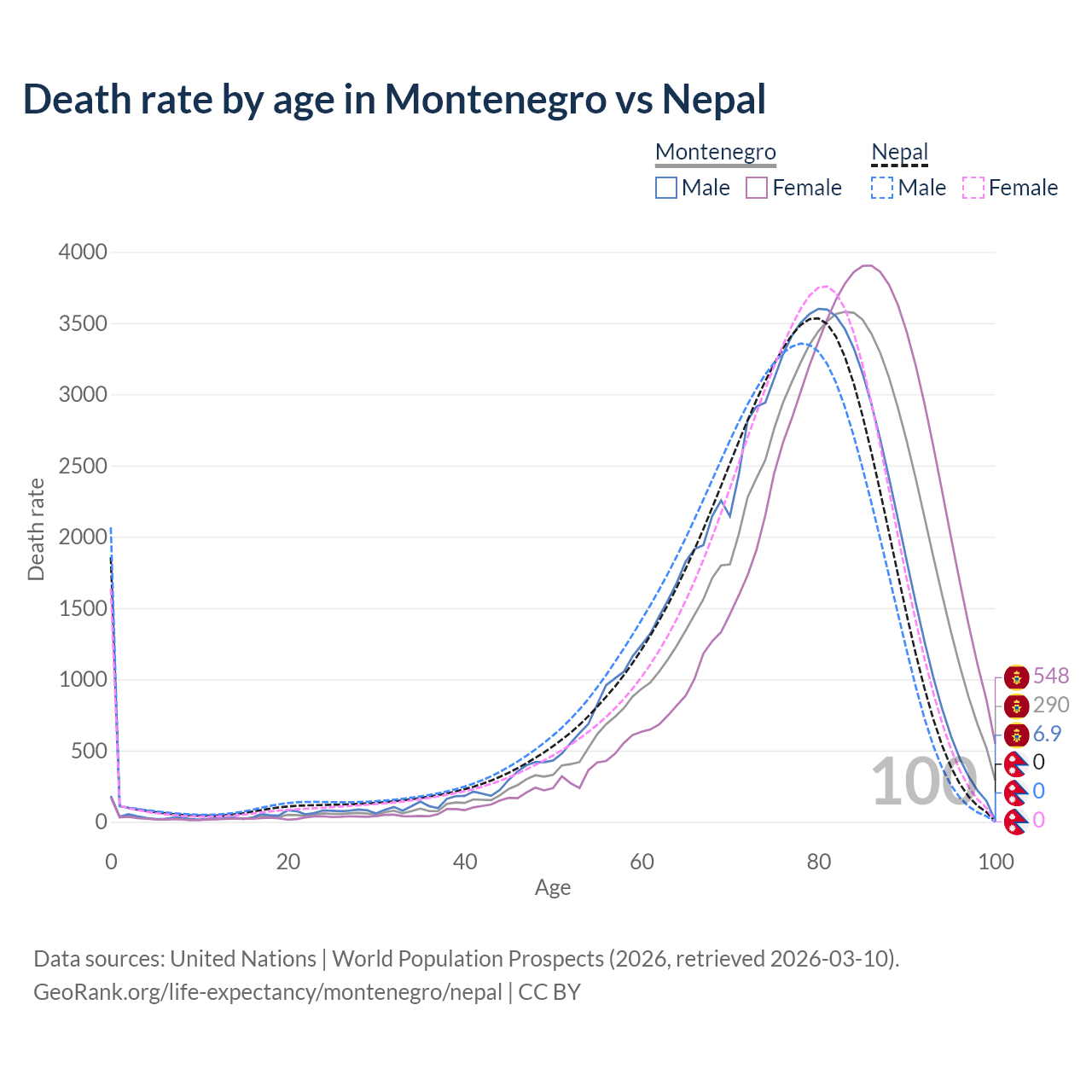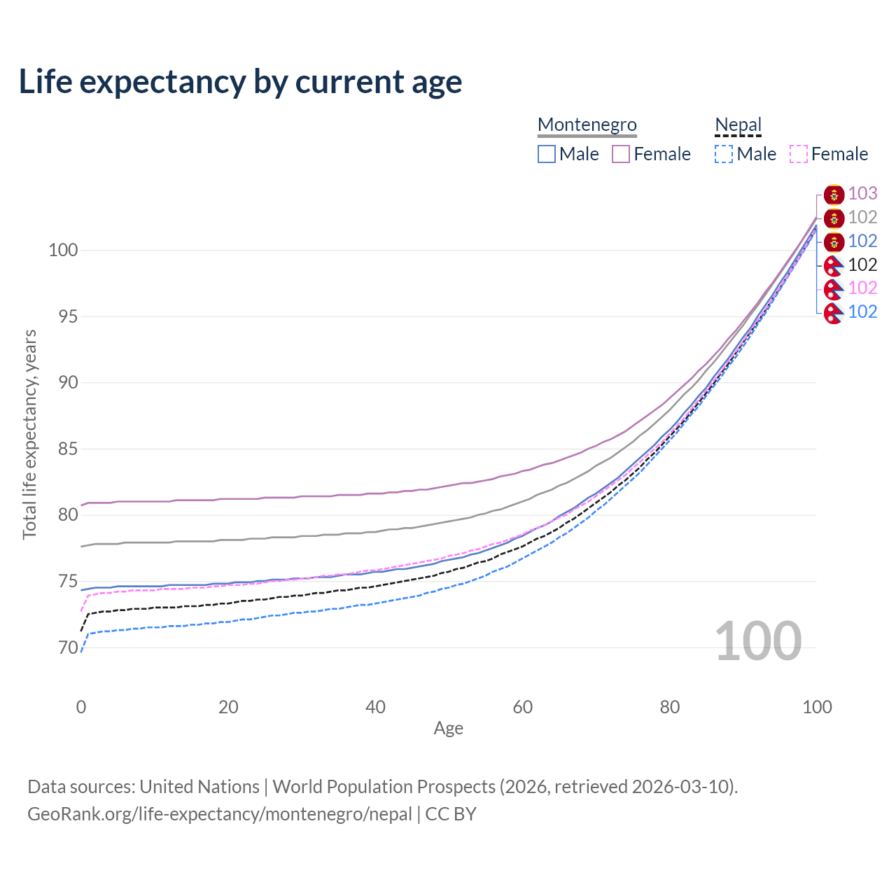This life expectancy calculator shows the odds of living to 100, 95, 90, and below based on current age for both males and females in Montenegro and Nepal, along with mean and median age of death. The calculations are based on the 2026 life tables (actuarial tables) from the UN World Population Prospects.