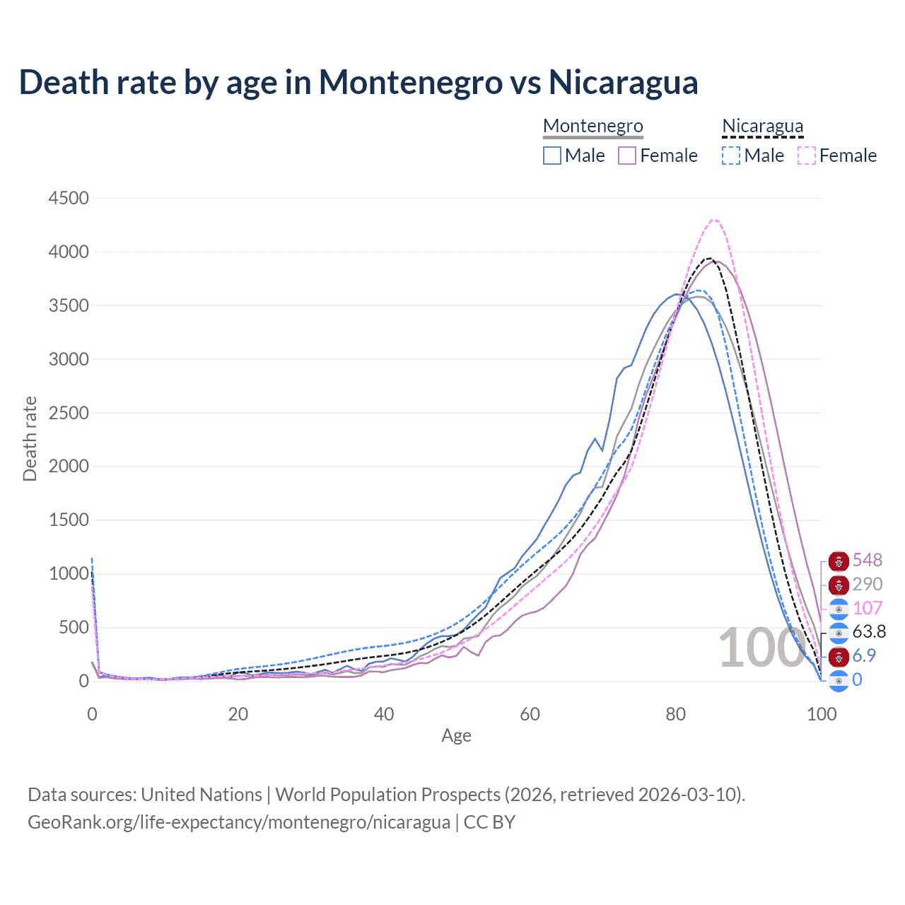 In Montenegro, the most common age of death is 83, compared to 85 in Nicaragua. The median age of death is 80.1 in Montenegro and 79.9 in Nicaragua, meaning only half of each cohort is expected to live past that age.
