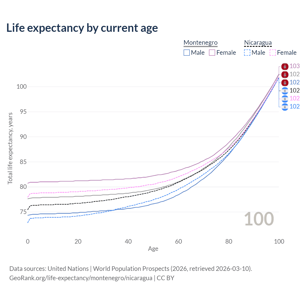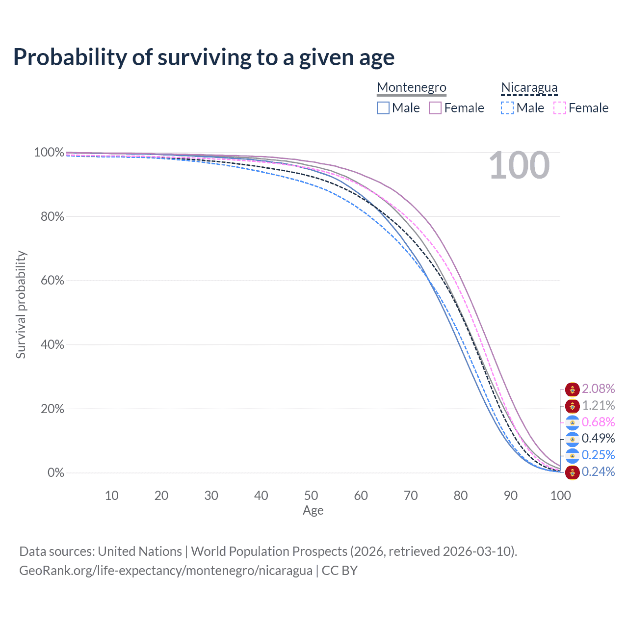 This life expectancy calculator shows the odds of living to 100, 95, 90, and below based on current age for both males and females in Montenegro and Nicaragua, along with mean and median age of death. The calculations are based on the 2026 life tables (actuarial tables) from the UN World Population Prospects.