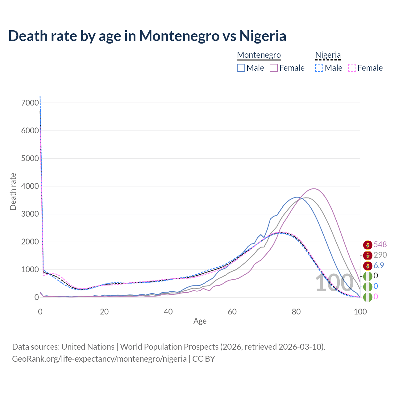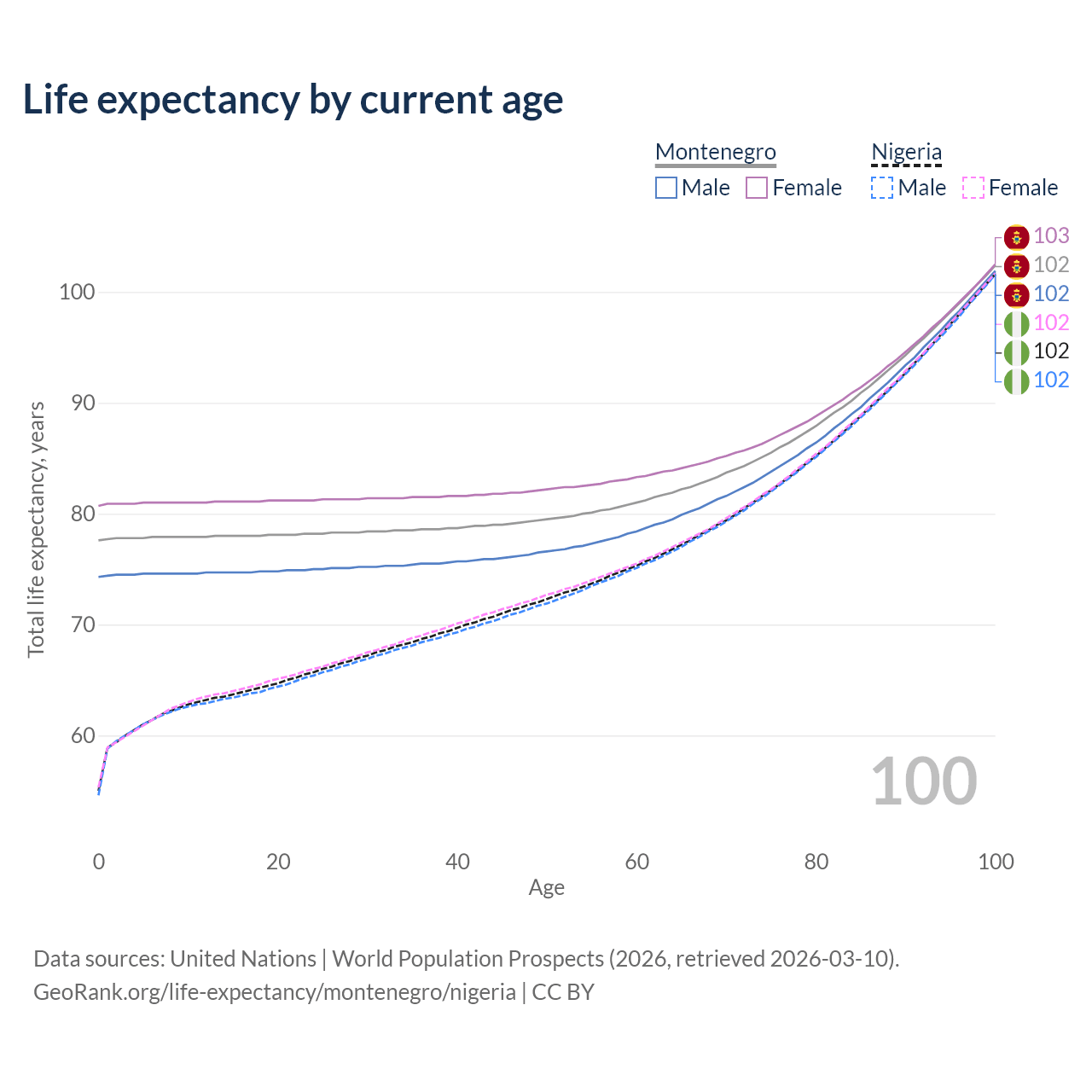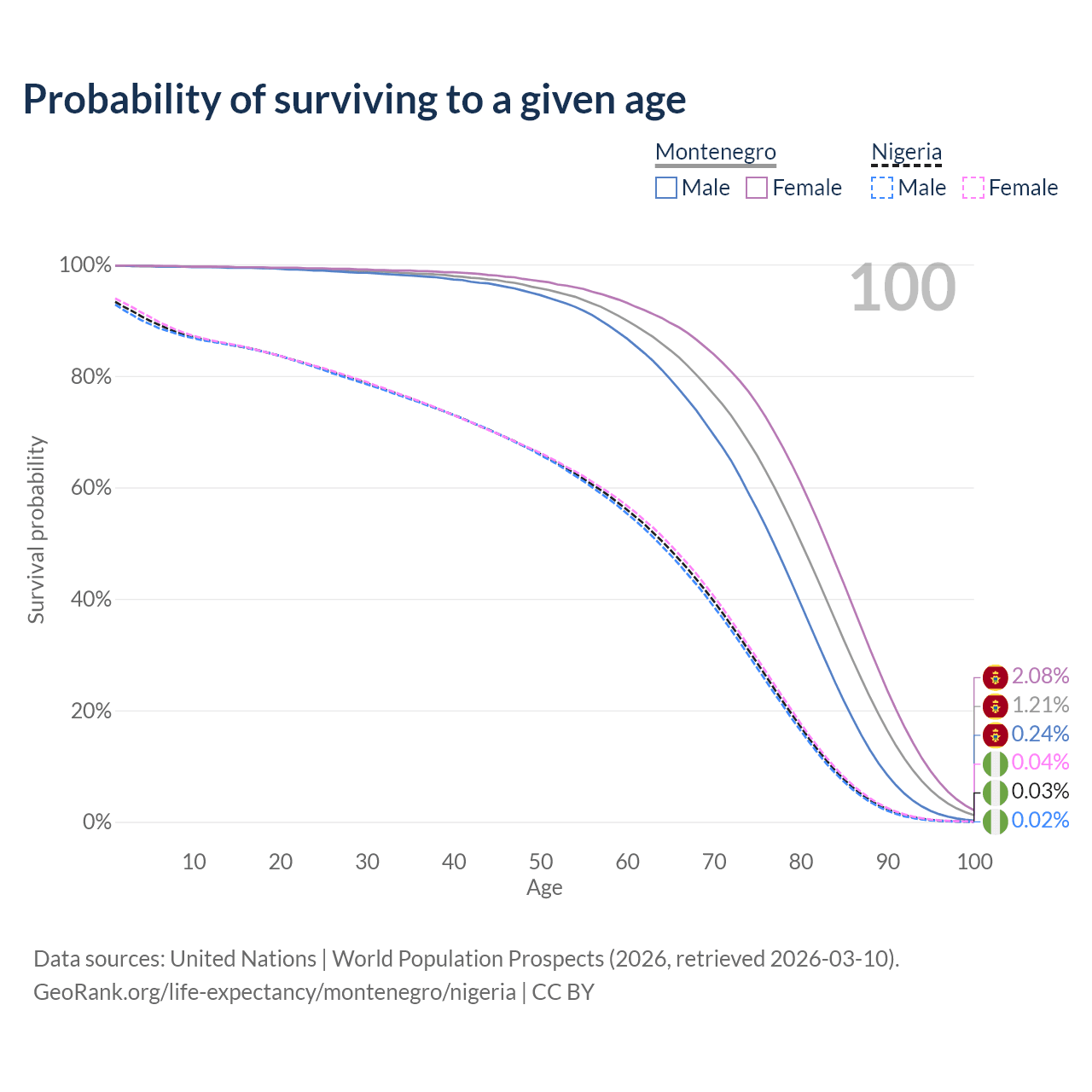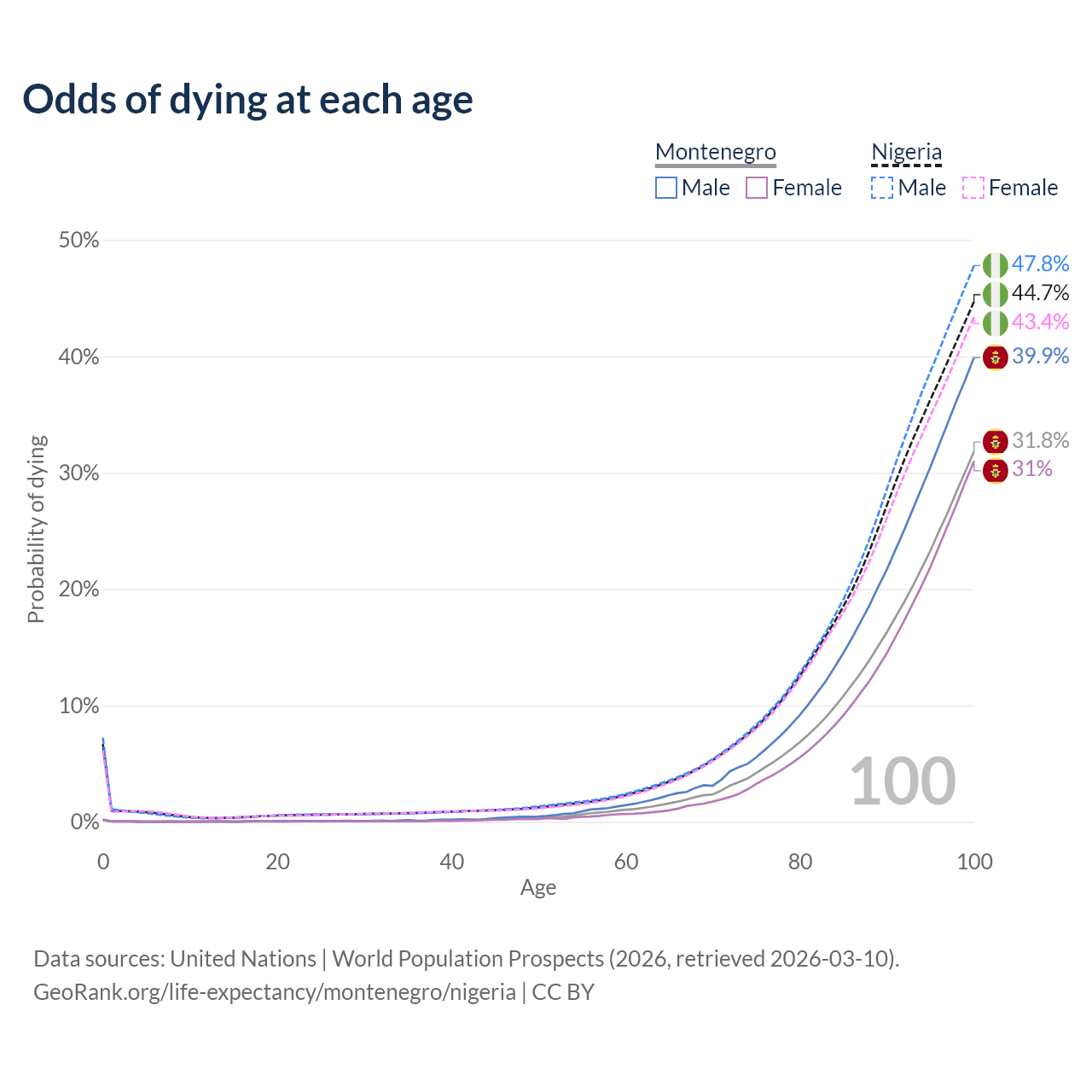 This life expectancy calculator shows the odds of living to 100, 95, 90, and below based on current age for both males and females in Montenegro and Nigeria, along with mean and median age of death. The calculations are based on the 2026 life tables (actuarial tables) from the UN World Population Prospects.