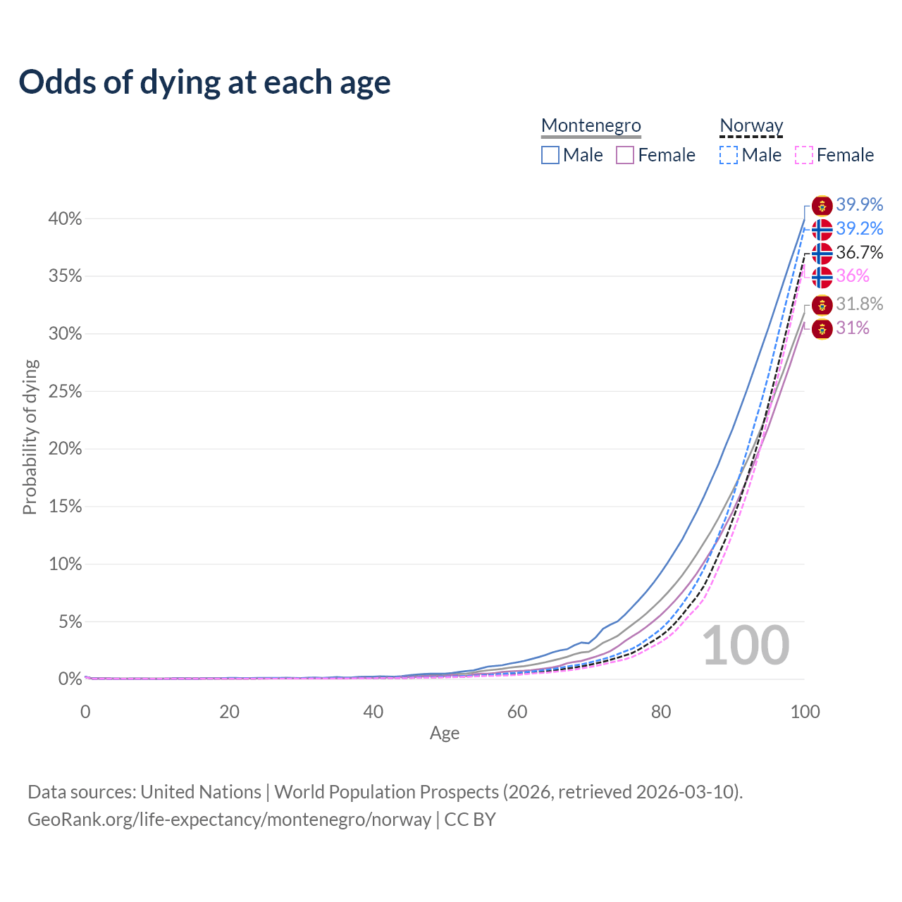 This life expectancy calculator shows the odds of living to 100, 95, 90, and below based on current age for both males and females in Montenegro and Norway, along with mean and median age of death. The calculations are based on the 2026 life tables (actuarial tables) from the UN World Population Prospects.