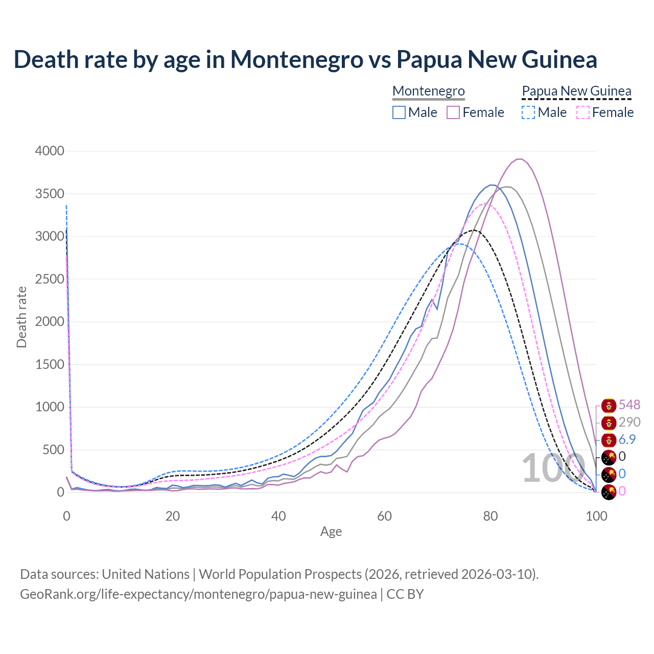 In Montenegro, the most common age of death is 83, compared to 0 in Papua New Guinea. The median age of death is 80.1 in Montenegro and 71.7 in Papua New Guinea, meaning only half of each cohort is expected to live past that age.