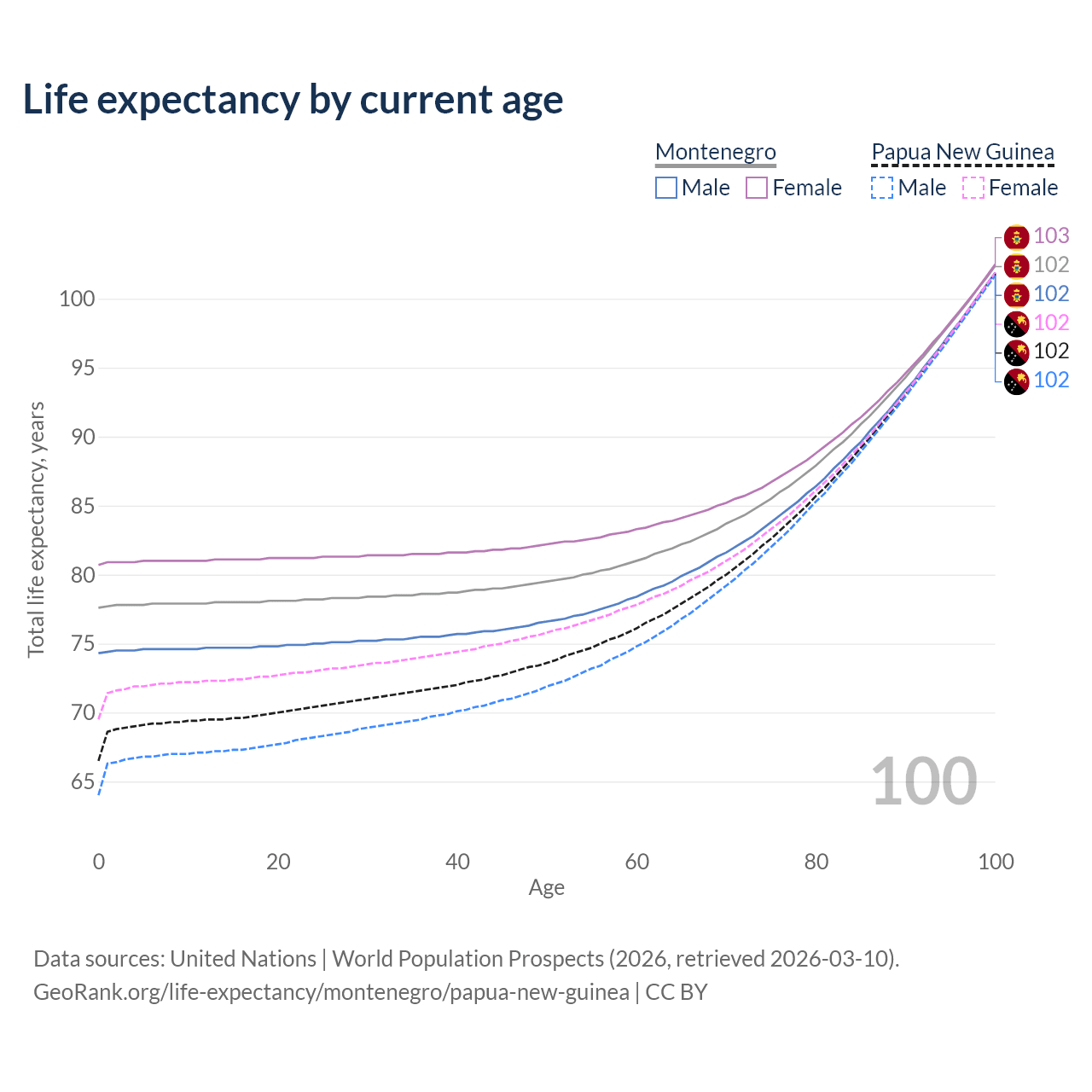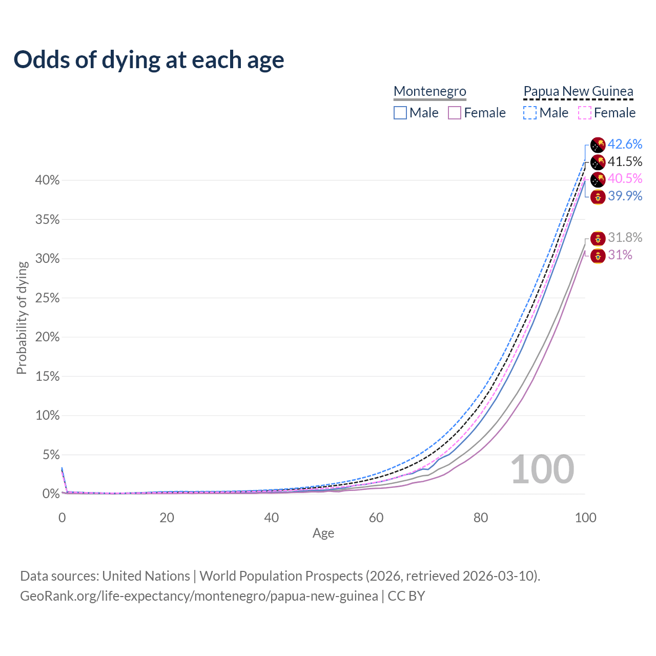 This life expectancy calculator shows the odds of living to 100, 95, 90, and below based on current age for both males and females in Montenegro and Papua New Guinea, along with mean and median age of death. The calculations are based on the 2026 life tables (actuarial tables) from the UN World Population Prospects.
