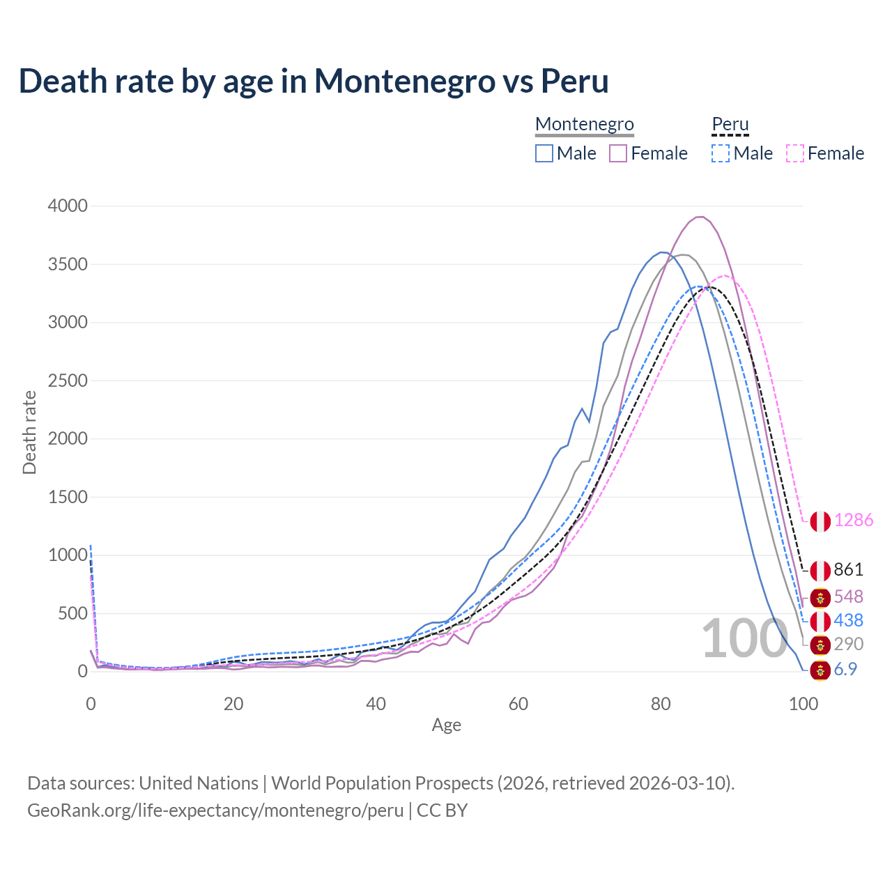 In Montenegro, the most common age of death is 83, compared to 87 in Peru. The median age of death is 80.1 in Montenegro and 82.4 in Peru, meaning only half of each cohort is expected to live past that age.