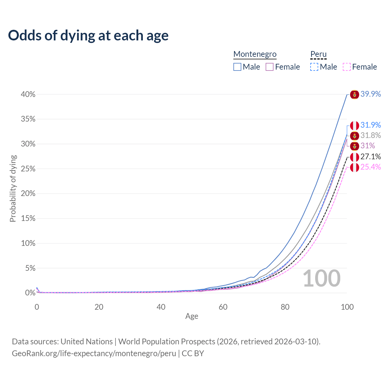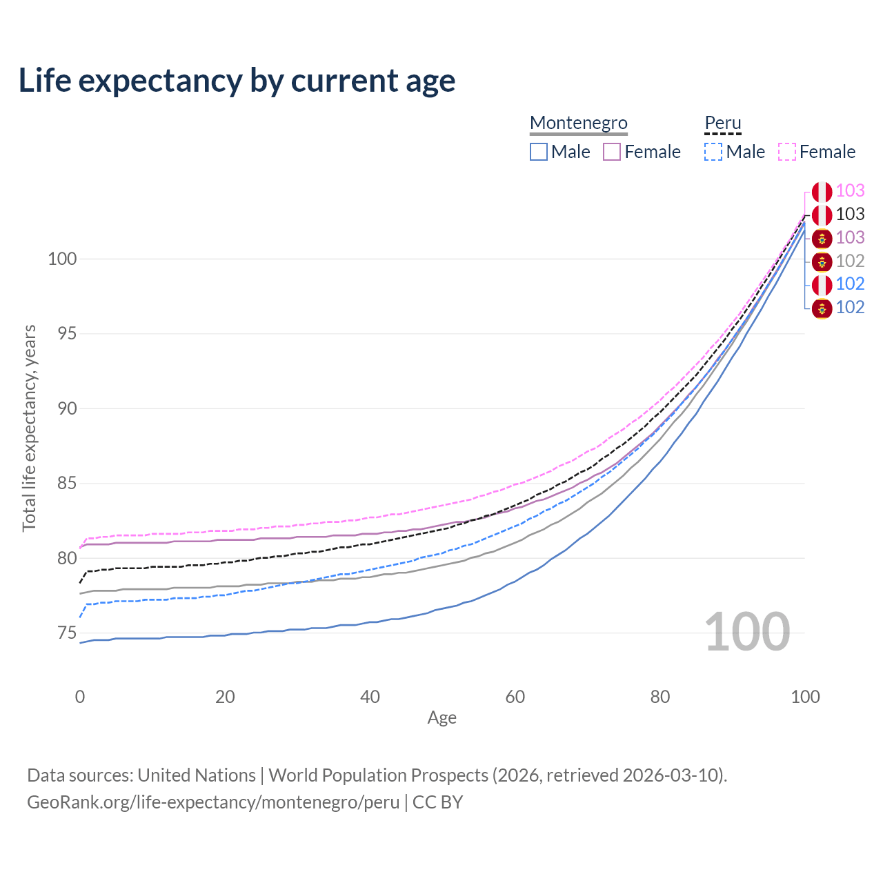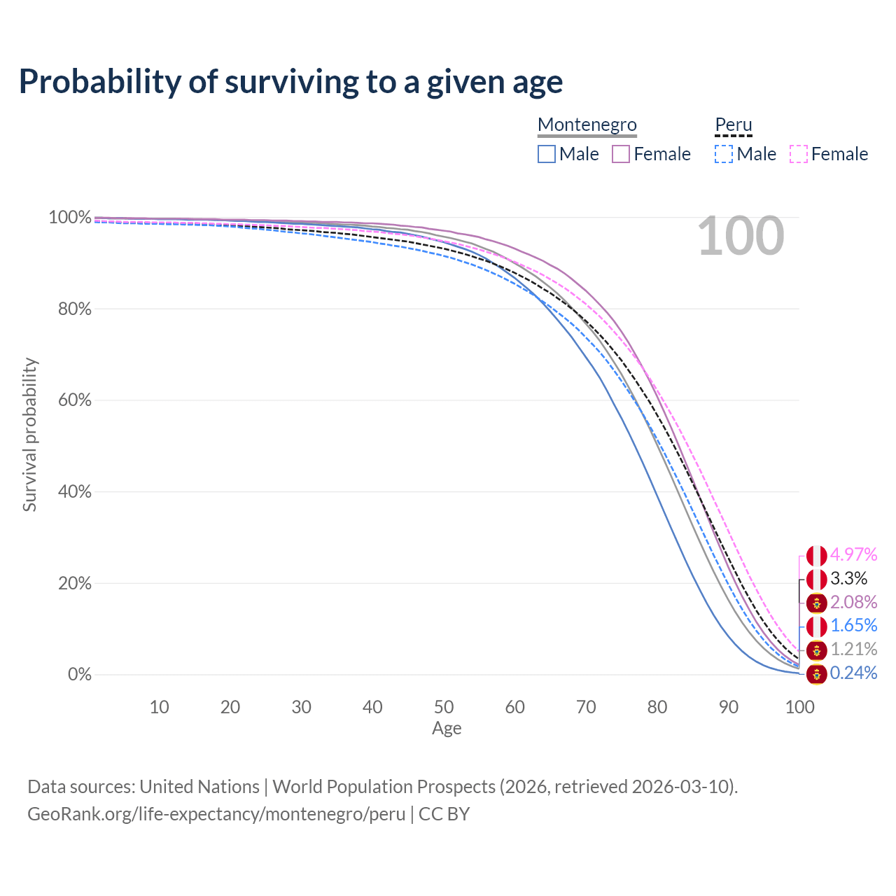 This life expectancy calculator shows the odds of living to 100, 95, 90, and below based on current age for both males and females in Montenegro and Peru, along with mean and median age of death. The calculations are based on the 2026 life tables (actuarial tables) from the UN World Population Prospects.