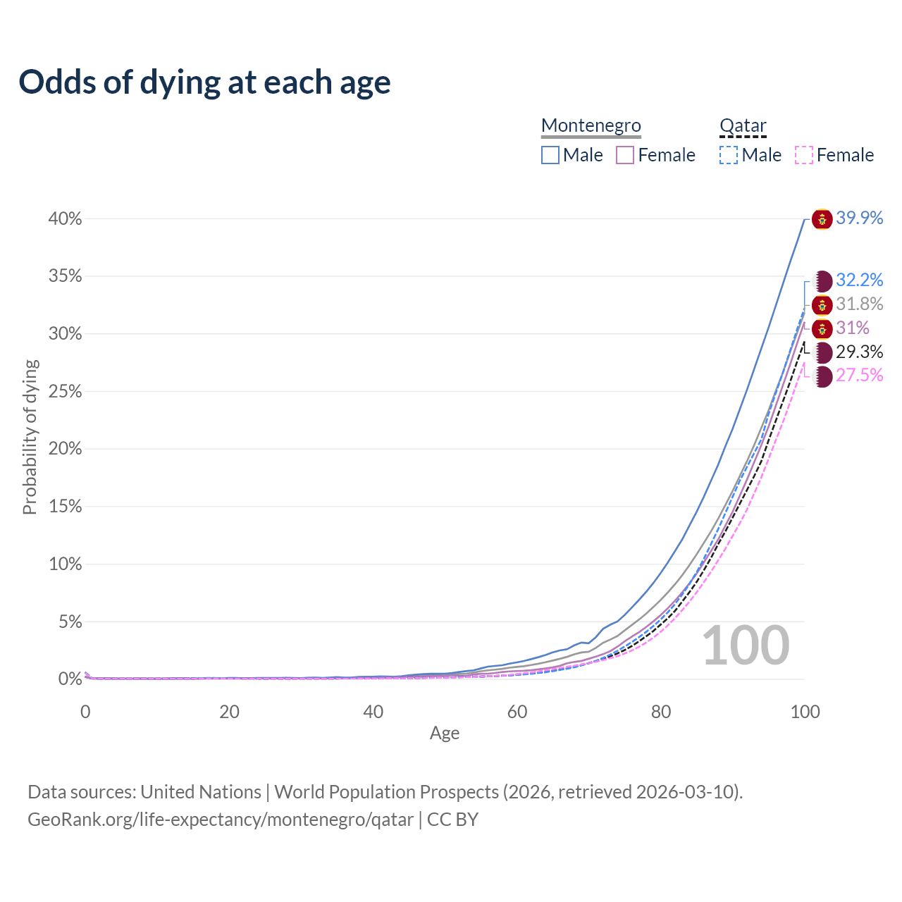 This life expectancy calculator shows the odds of living to 100, 95, 90, and below based on current age for both males and females in Montenegro and Qatar, along with mean and median age of death. The calculations are based on the 2026 life tables (actuarial tables) from the UN World Population Prospects.