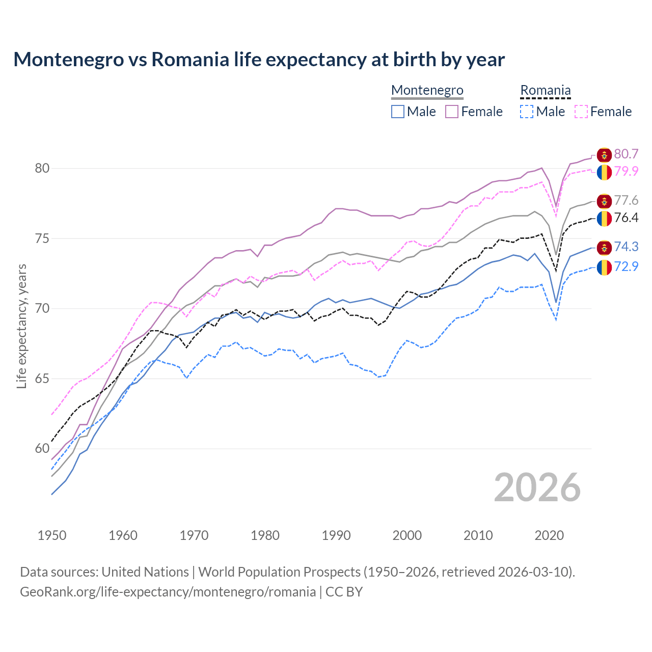 GeoRank.org/life-expectancy/montenegro/romania | CC BY