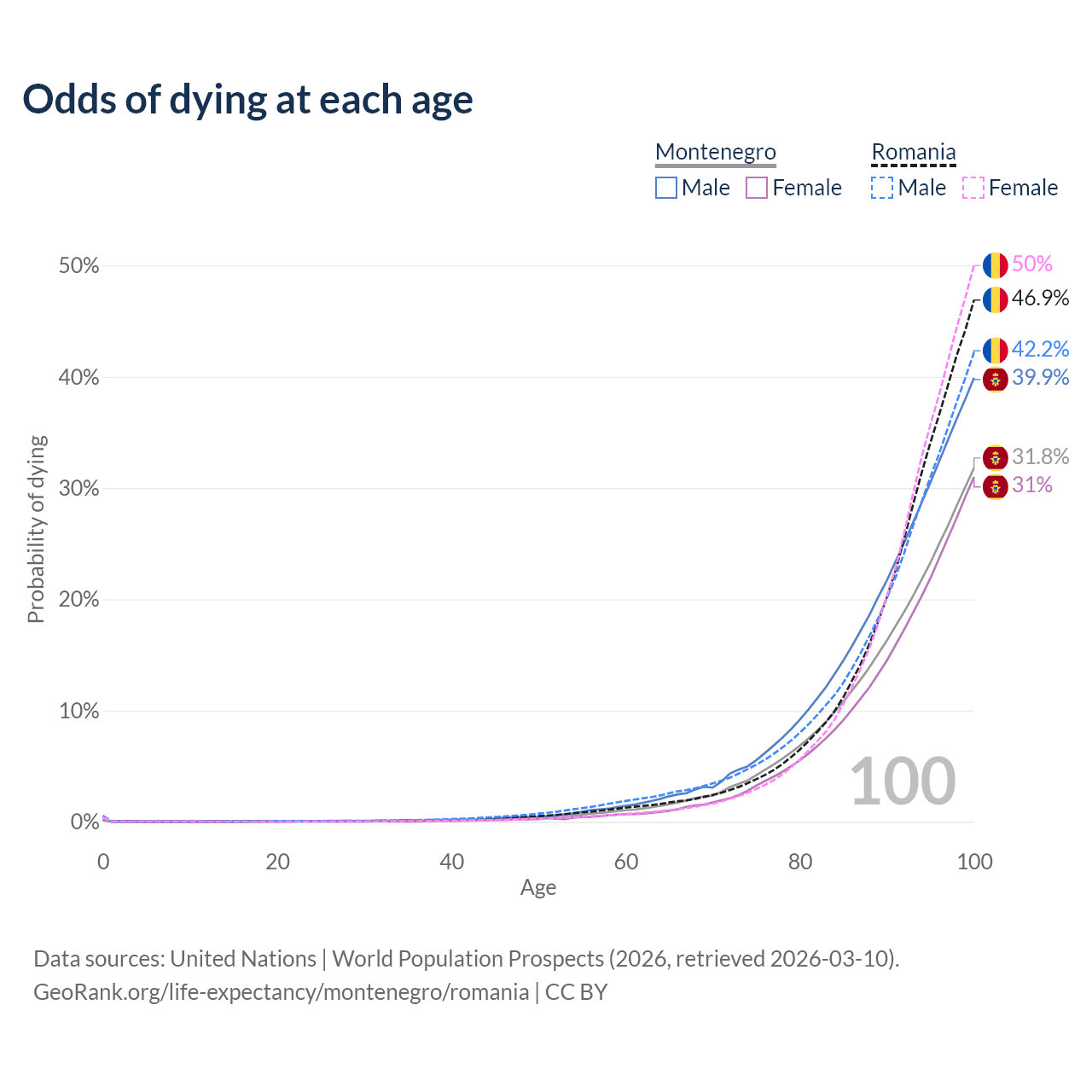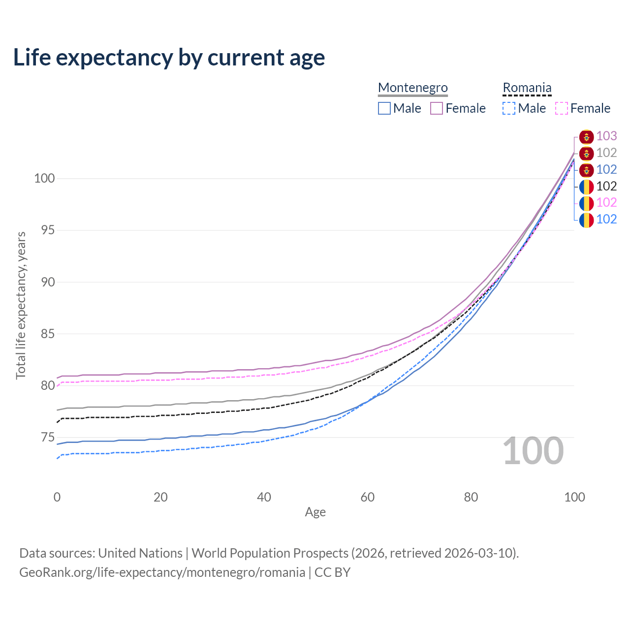 This life expectancy calculator shows the odds of living to 100, 95, 90, and below based on current age for both males and females in Montenegro and Romania, along with mean and median age of death. The calculations are based on the 2026 life tables (actuarial tables) from the UN World Population Prospects.