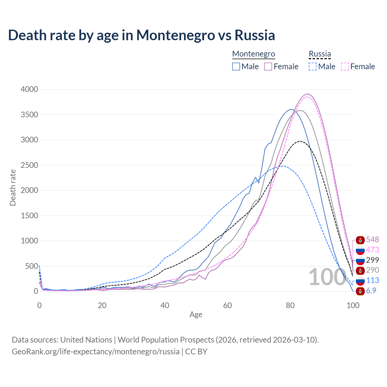 This life expectancy calculator shows the odds of living to 100, 95, 90, and below based on current age for both males and females in Montenegro and Russia, along with mean and median age of death. The calculations are based on the 2026 life tables (actuarial tables) from the UN World Population Prospects.
