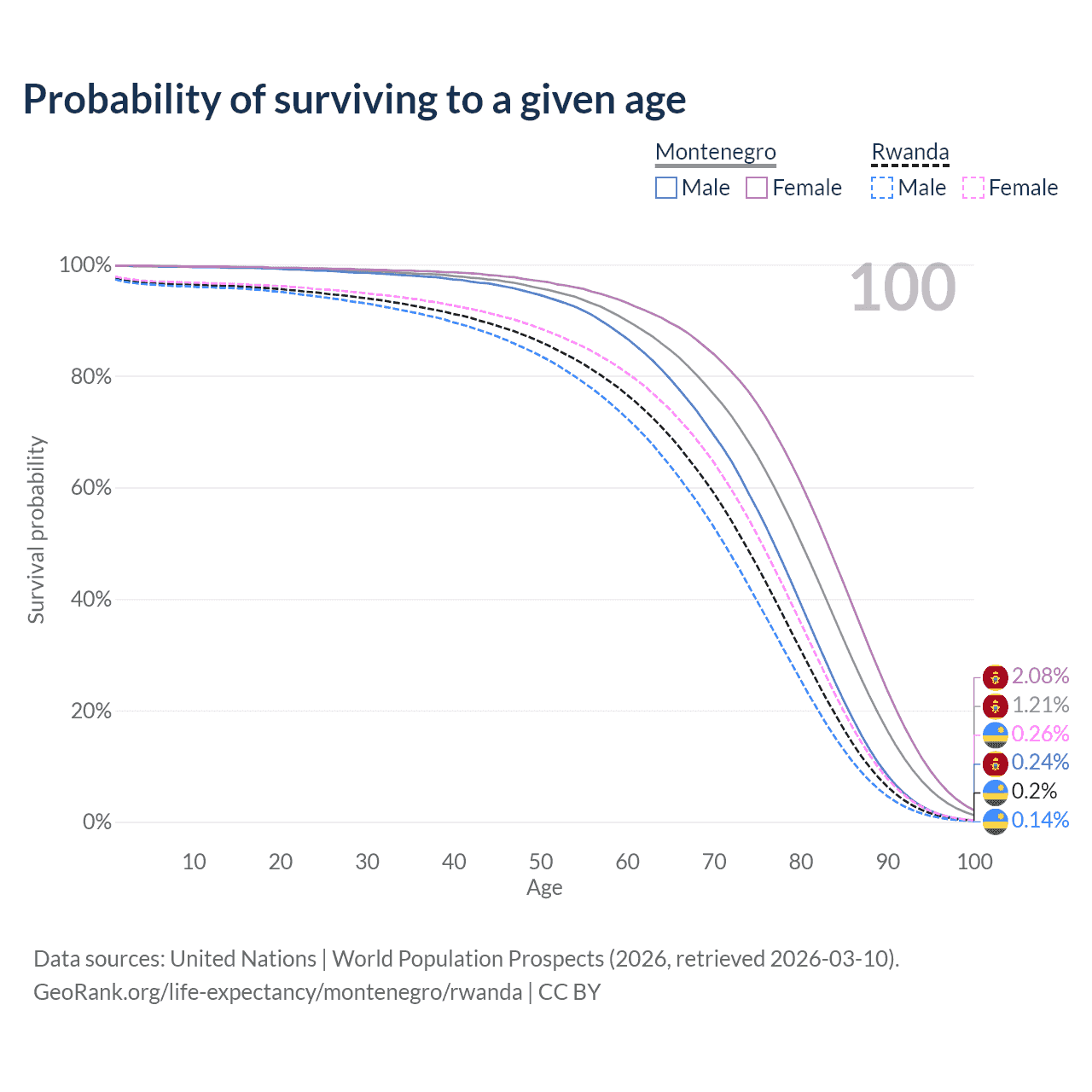 This life expectancy calculator shows the odds of living to 100, 95, 90, and below based on current age for both males and females in Montenegro and Rwanda, along with mean and median age of death. The calculations are based on the 2026 life tables (actuarial tables) from the UN World Population Prospects.