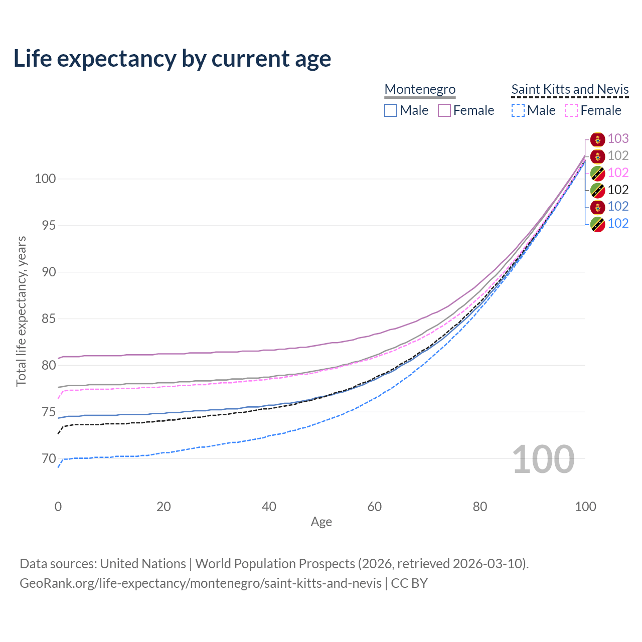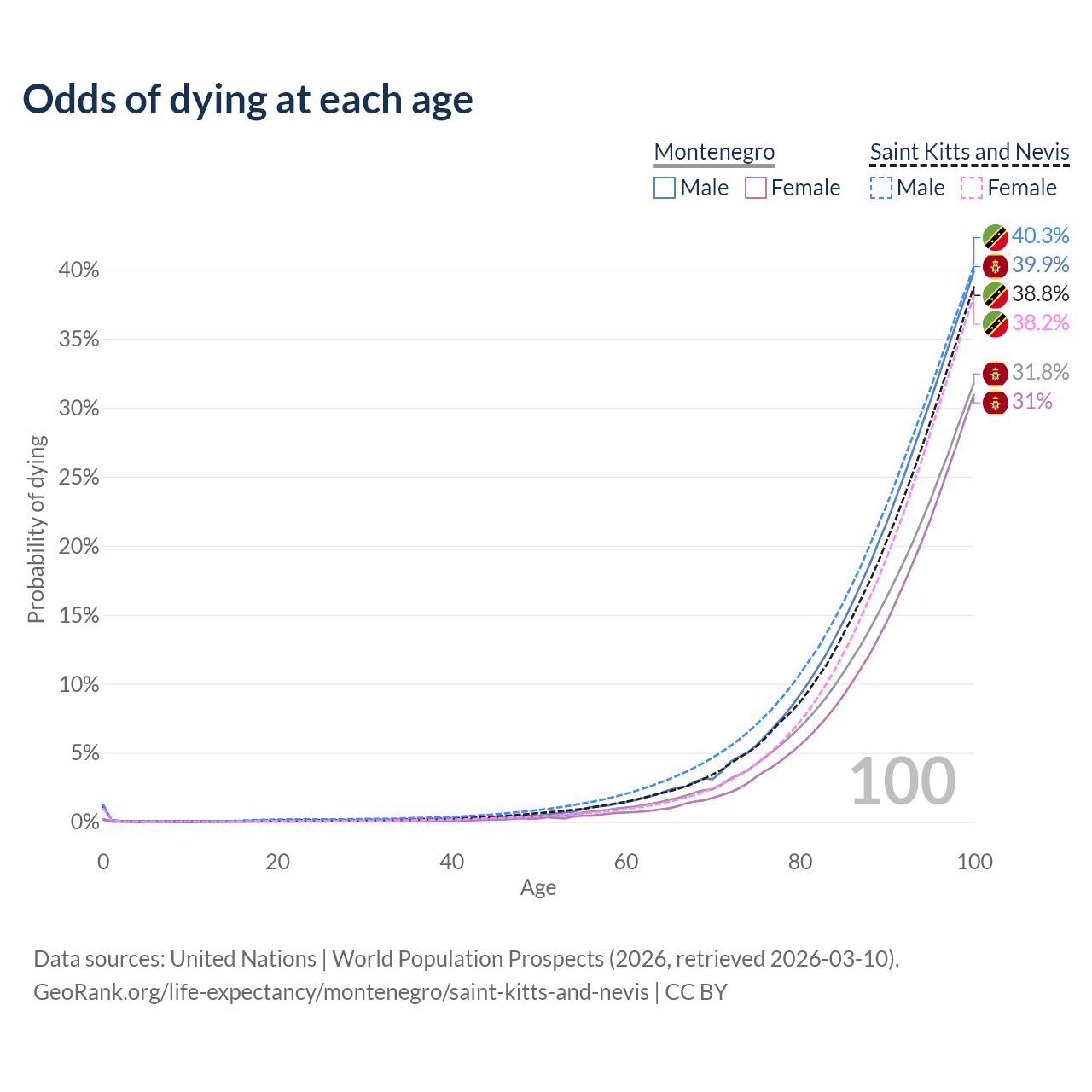 This life expectancy calculator shows the odds of living to 100, 95, 90, and below based on current age for both males and females in Montenegro and Saint Kitts and Nevis, along with mean and median age of death. The calculations are based on the 2026 life tables (actuarial tables) from the UN World Population Prospects.