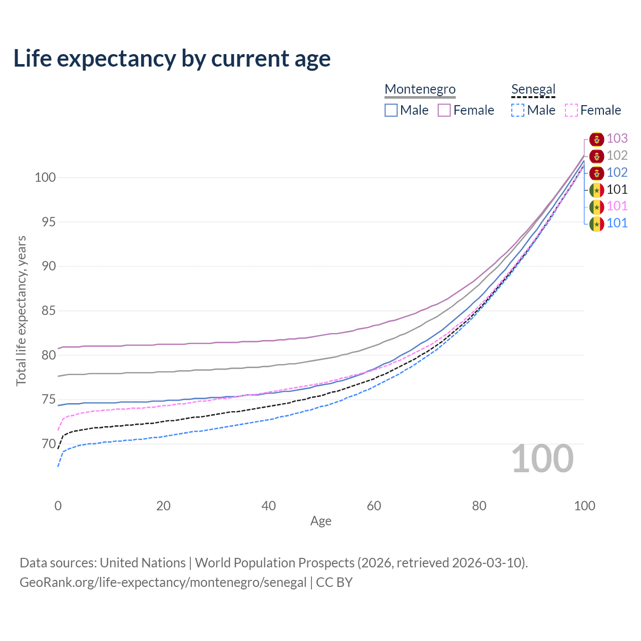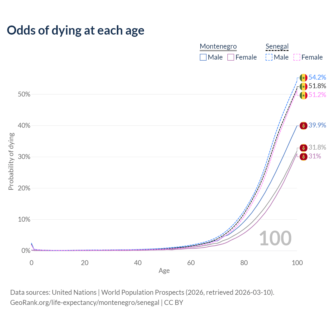 This life expectancy calculator shows the odds of living to 100, 95, 90, and below based on current age for both males and females in Montenegro and Senegal, along with mean and median age of death. The calculations are based on the 2026 life tables (actuarial tables) from the UN World Population Prospects.