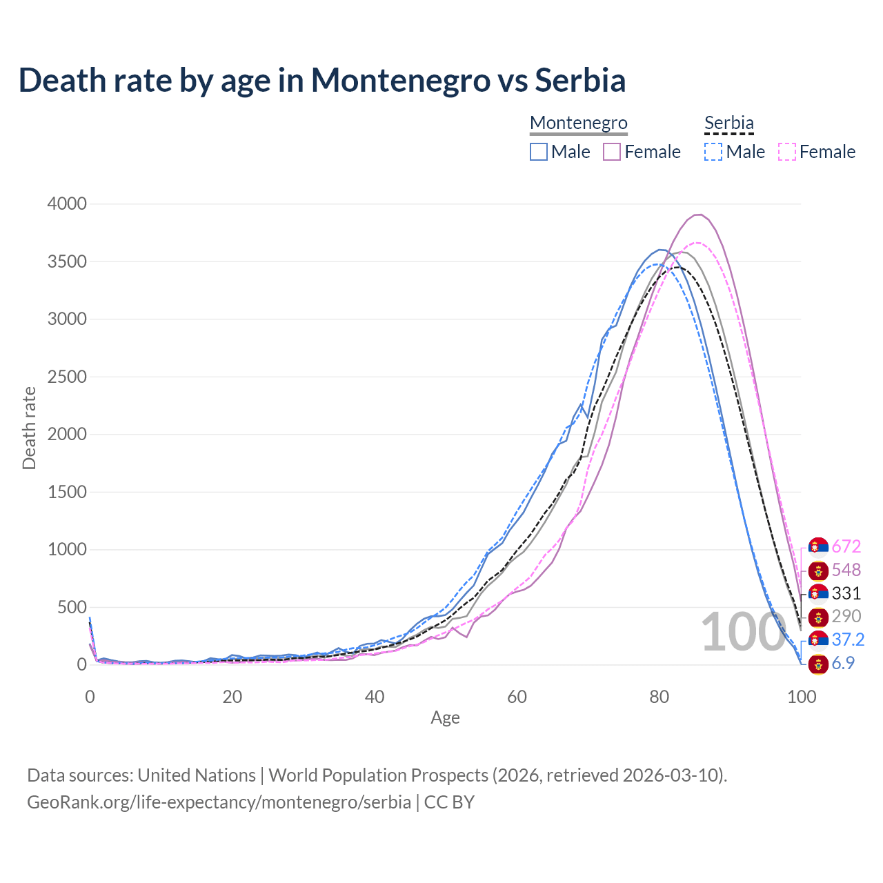 This life expectancy calculator shows the odds of living to 100, 95, 90, and below based on current age for both males and females in Montenegro and Serbia, along with mean and median age of death. The calculations are based on the 2026 life tables (actuarial tables) from the UN World Population Prospects.