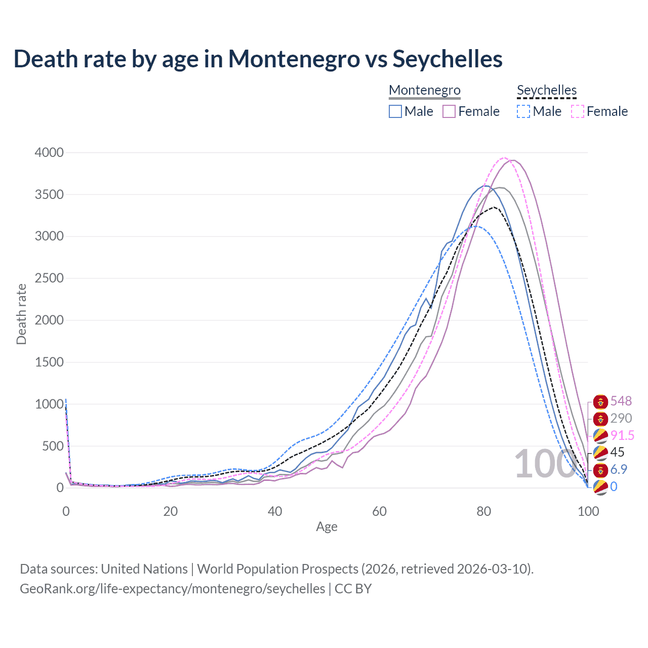 In Montenegro, the most common age of death is 83, compared to 82 in the Seychelles. The median age of death is 80.1 in Montenegro and 77 in the Seychelles, meaning only half of each cohort is expected to live past that age.