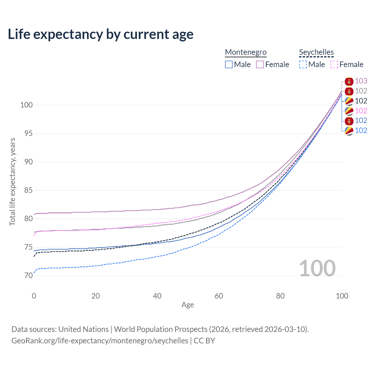This life expectancy calculator shows the odds of living to 100, 95, 90, and below based on current age for both males and females in Montenegro and the Seychelles, along with mean and median age of death. The calculations are based on the 2026 life tables (actuarial tables) from the UN World Population Prospects.