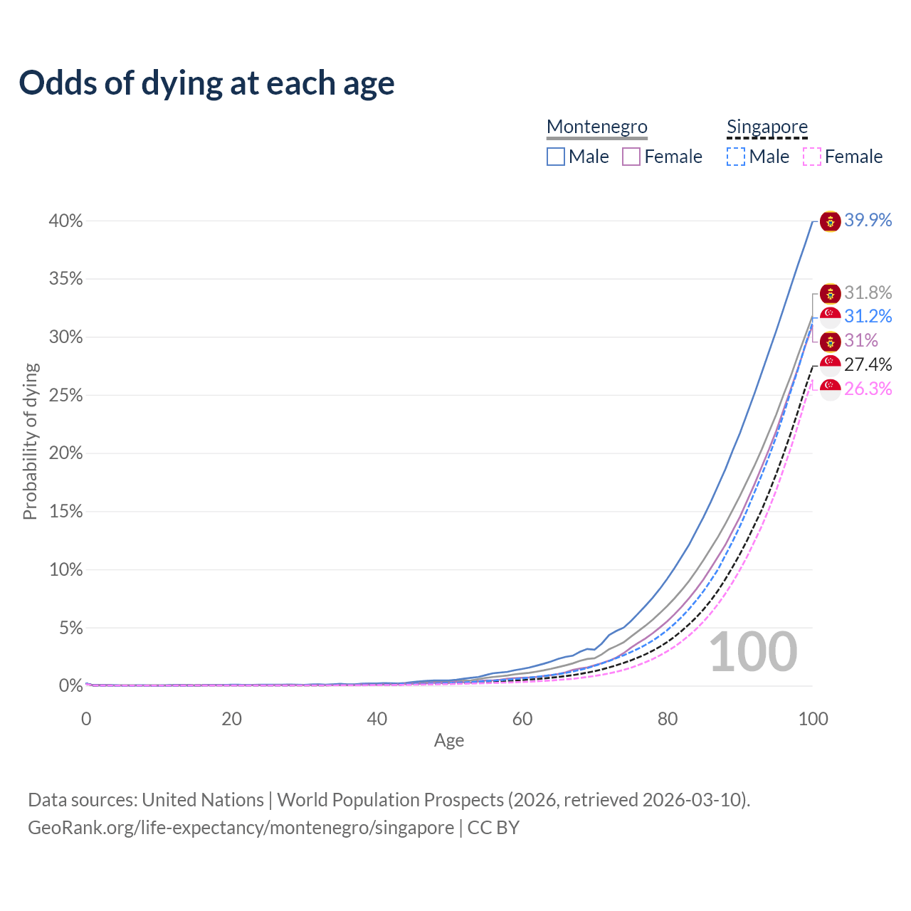 This life expectancy calculator shows the odds of living to 100, 95, 90, and below based on current age for both males and females in Montenegro and Singapore, along with mean and median age of death. The calculations are based on the 2026 life tables (actuarial tables) from the UN World Population Prospects.