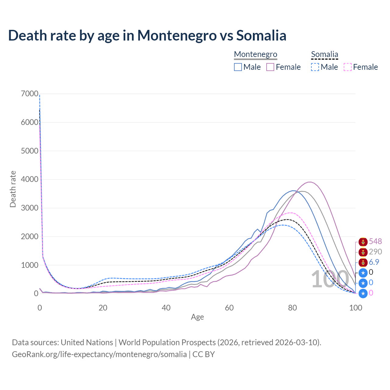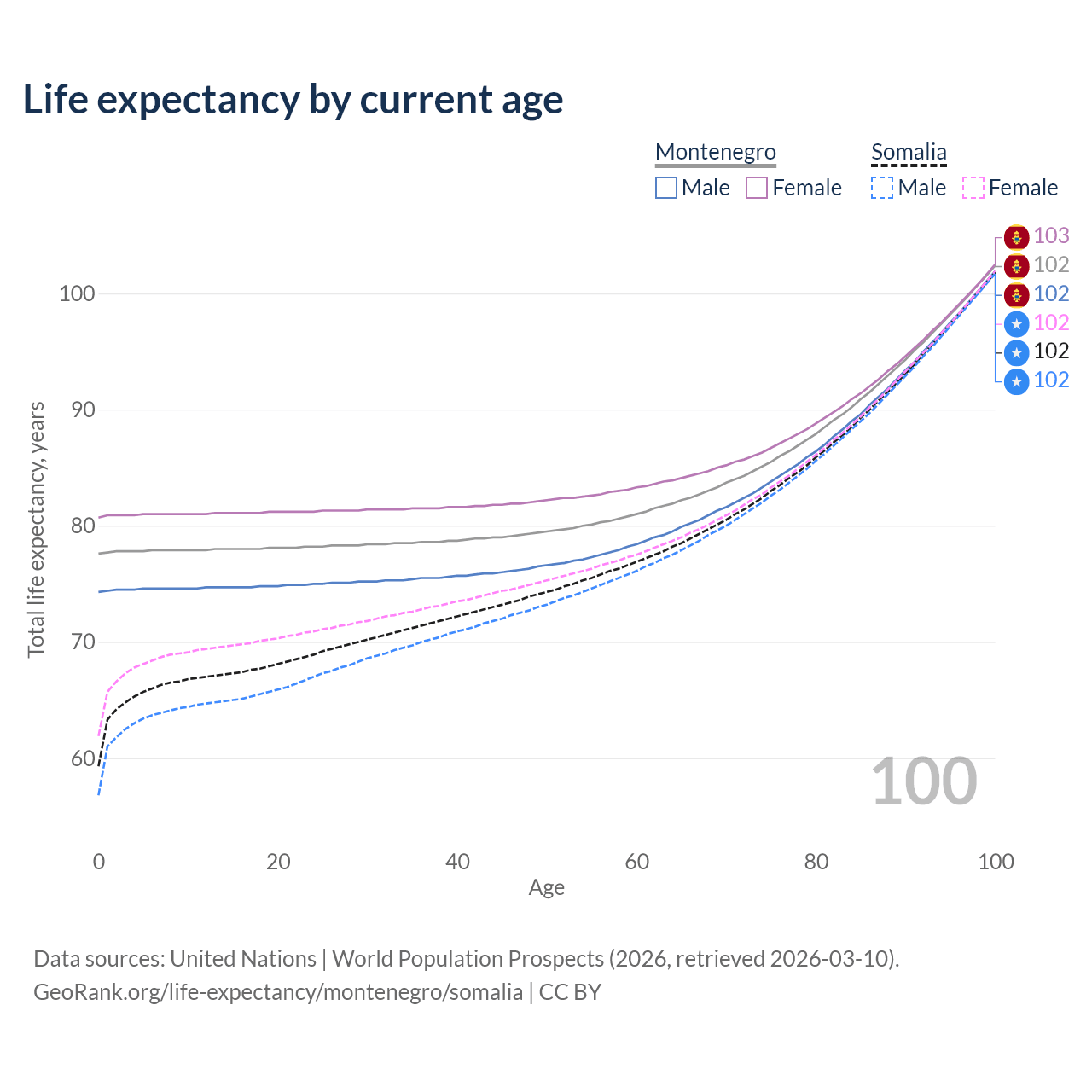 This life expectancy calculator shows the odds of living to 100, 95, 90, and below based on current age for both males and females in Montenegro and Somalia, along with mean and median age of death. The calculations are based on the 2026 life tables (actuarial tables) from the UN World Population Prospects.