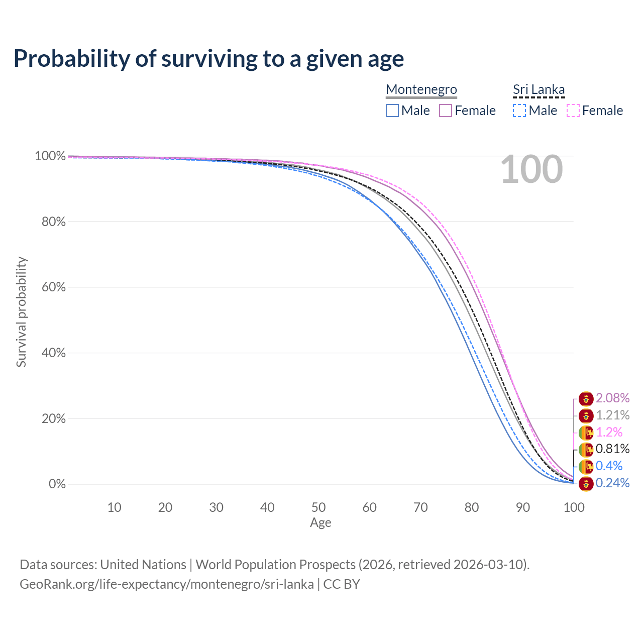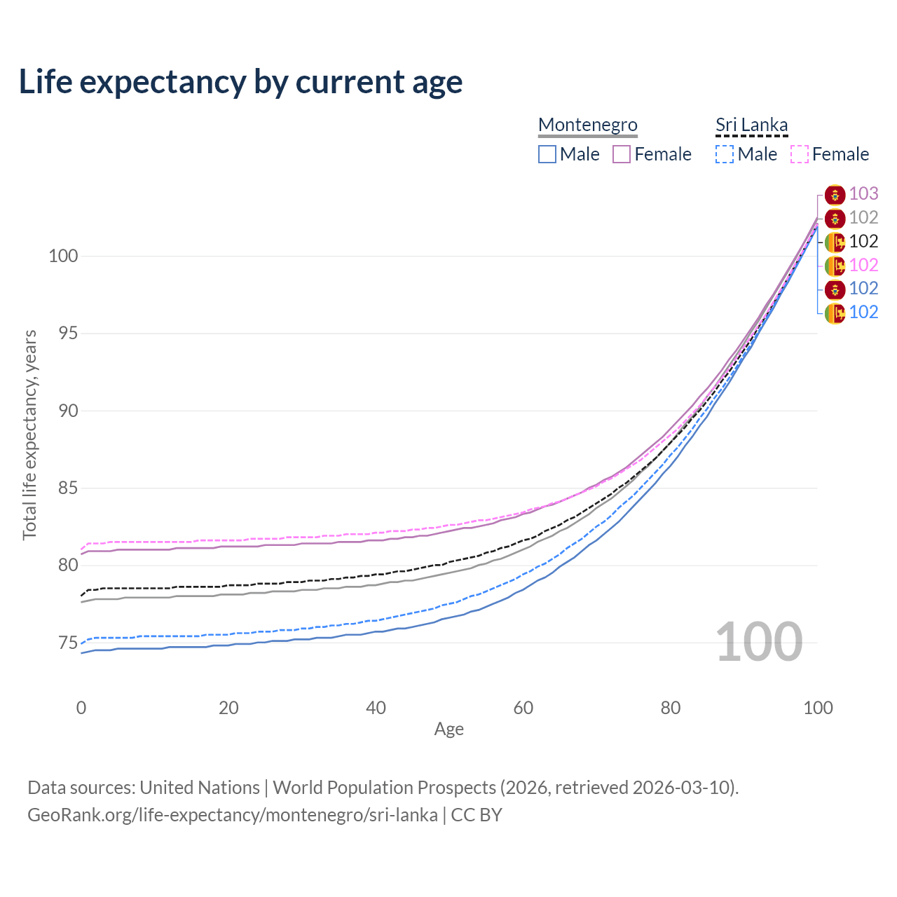 This life expectancy calculator shows the odds of living to 100, 95, 90, and below based on current age for both males and females in Montenegro and Sri Lanka, along with mean and median age of death. The calculations are based on the 2026 life tables (actuarial tables) from the UN World Population Prospects.