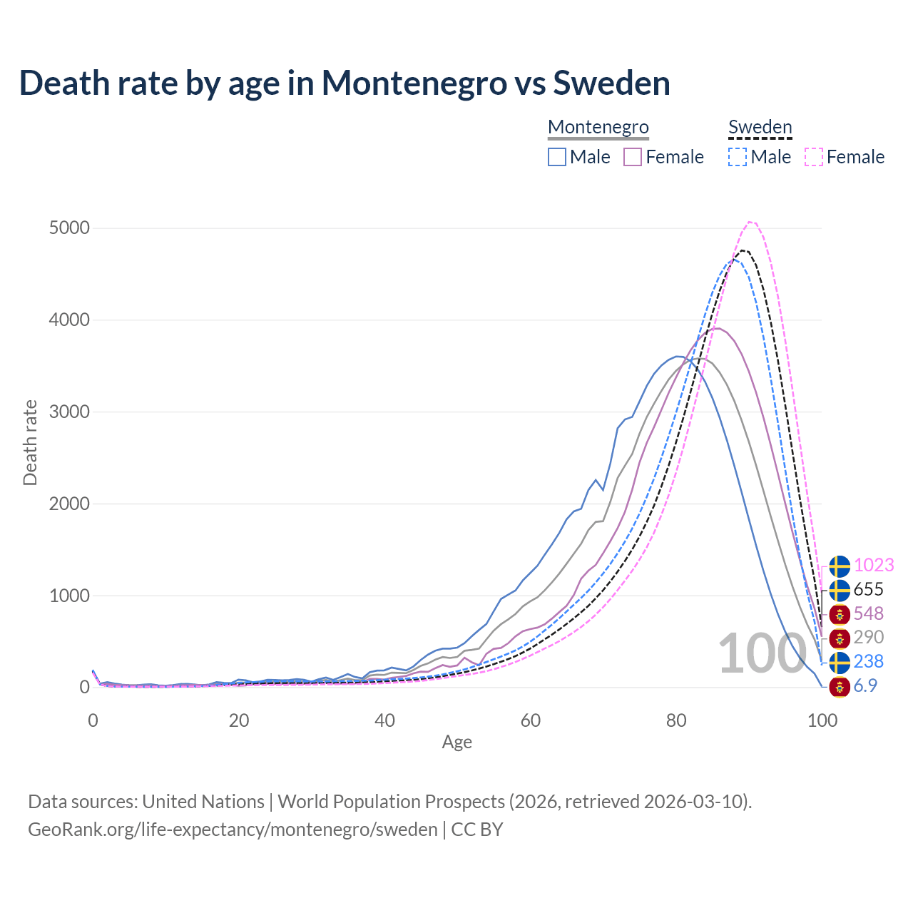 This life expectancy calculator shows the odds of living to 100, 95, 90, and below based on current age for both males and females in Montenegro and Sweden, along with mean and median age of death. The calculations are based on the 2026 life tables (actuarial tables) from the UN World Population Prospects.