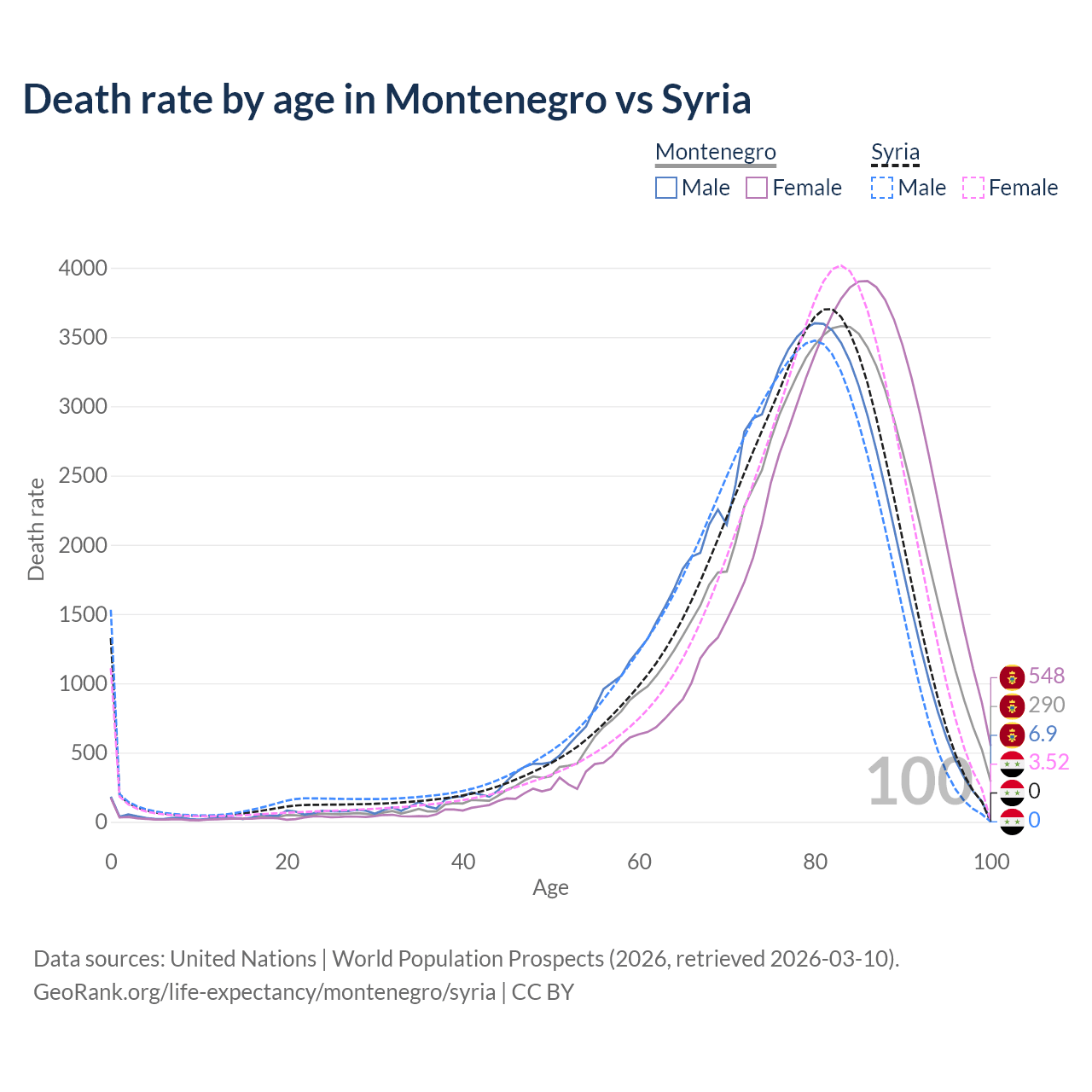 This life expectancy calculator shows the odds of living to 100, 95, 90, and below based on current age for both males and females in Montenegro and Syria, along with mean and median age of death. The calculations are based on the 2026 life tables (actuarial tables) from the UN World Population Prospects.