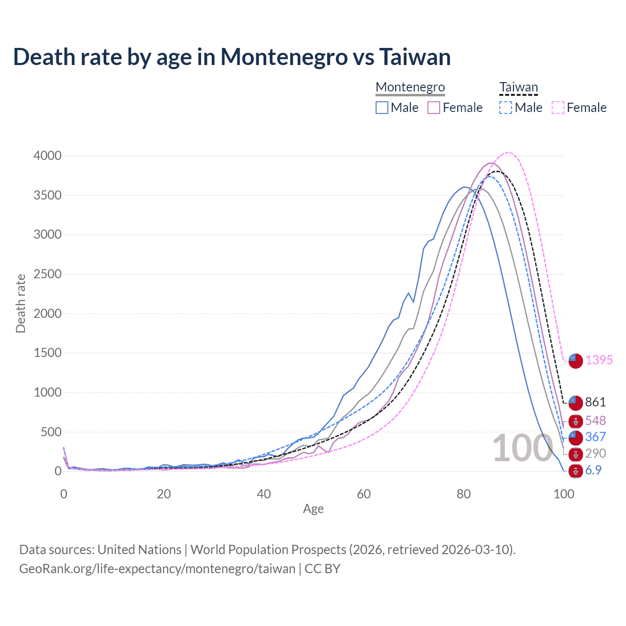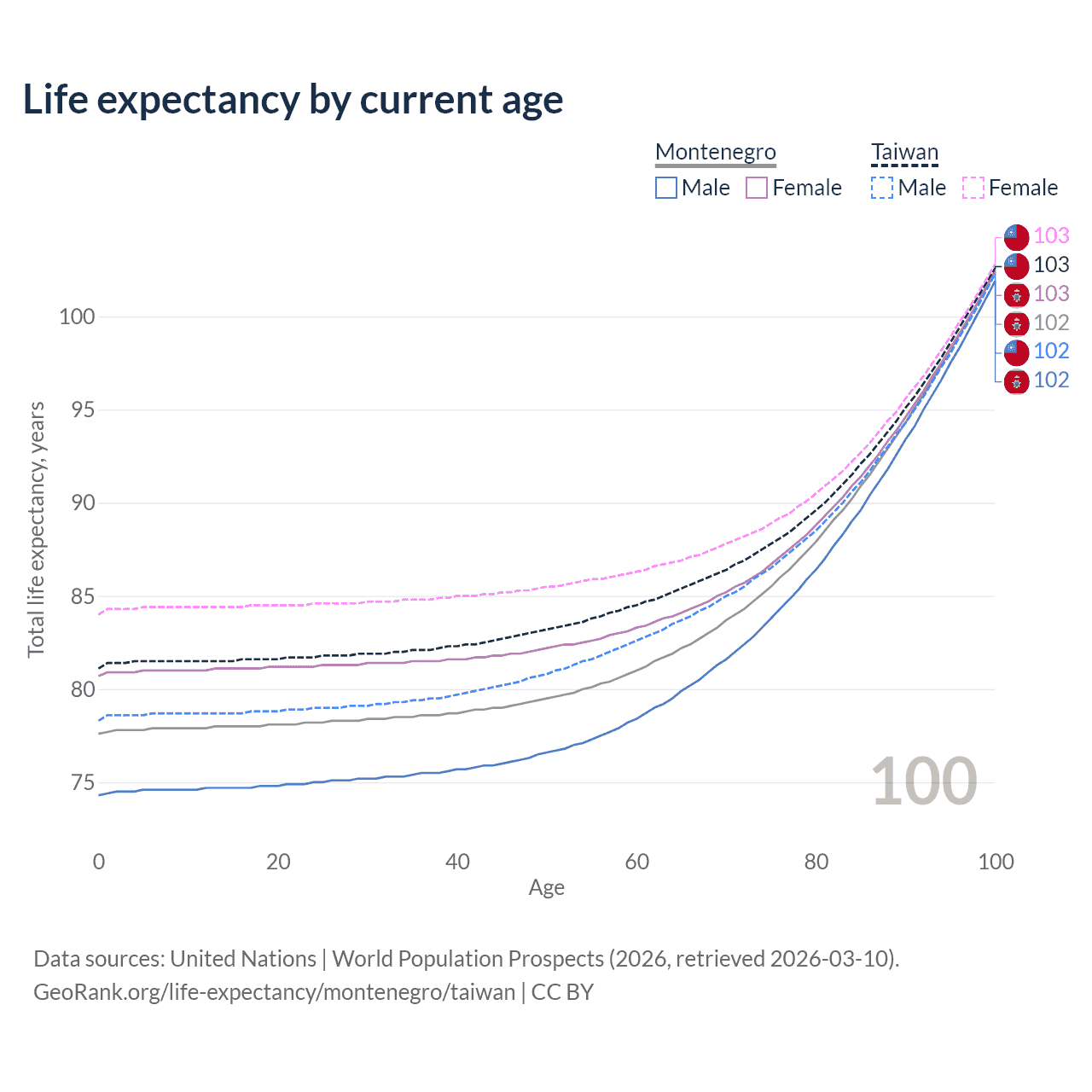This life expectancy calculator shows the odds of living to 100, 95, 90, and below based on current age for both males and females in Montenegro and Taiwan, along with mean and median age of death. The calculations are based on the 2026 life tables (actuarial tables) from the UN World Population Prospects.