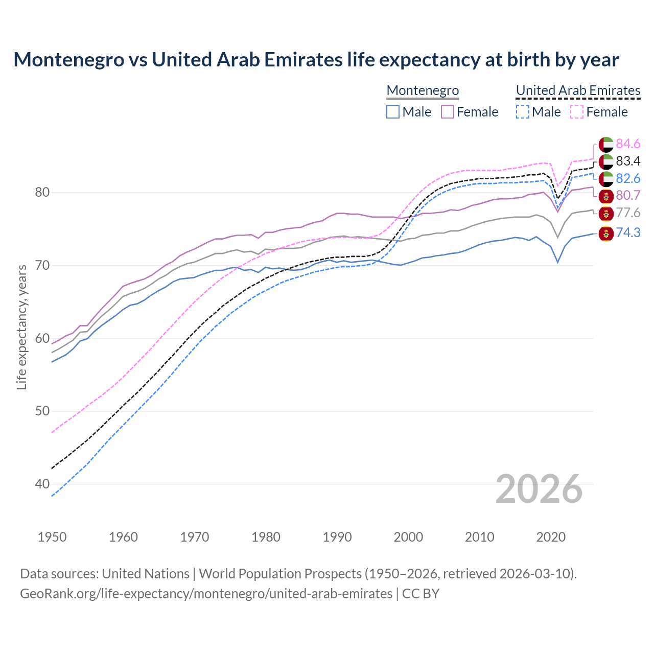 The average life expectancy at birth is 77.6 years in Montenegro vs 83.4 in the United Arab Emirates. Montenegro is ranked 68/197 by life expectancy, and the United Arab Emirates is 17/197. In Montenegro, the life expectancy is 74.3 years for males and 80.7 years for females. In the United Arab Emirates, it's 82.6 years for males and 84.6 years for females.