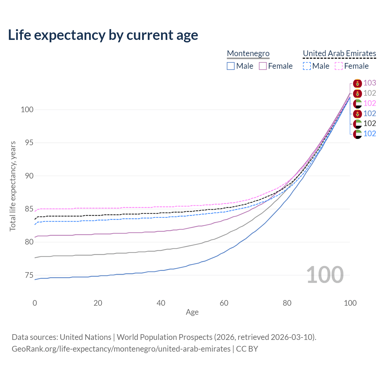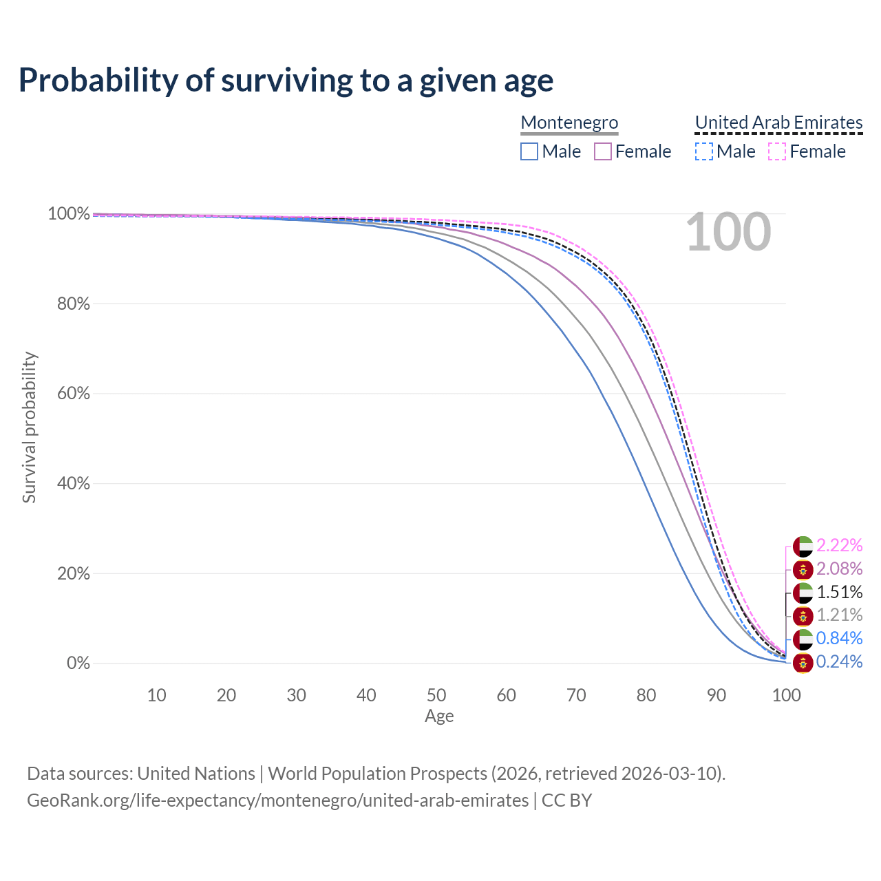 This life expectancy calculator shows the odds of living to 100, 95, 90, and below based on current age for both males and females in Montenegro and the United Arab Emirates, along with mean and median age of death. The calculations are based on the 2026 life tables (actuarial tables) from the UN World Population Prospects.