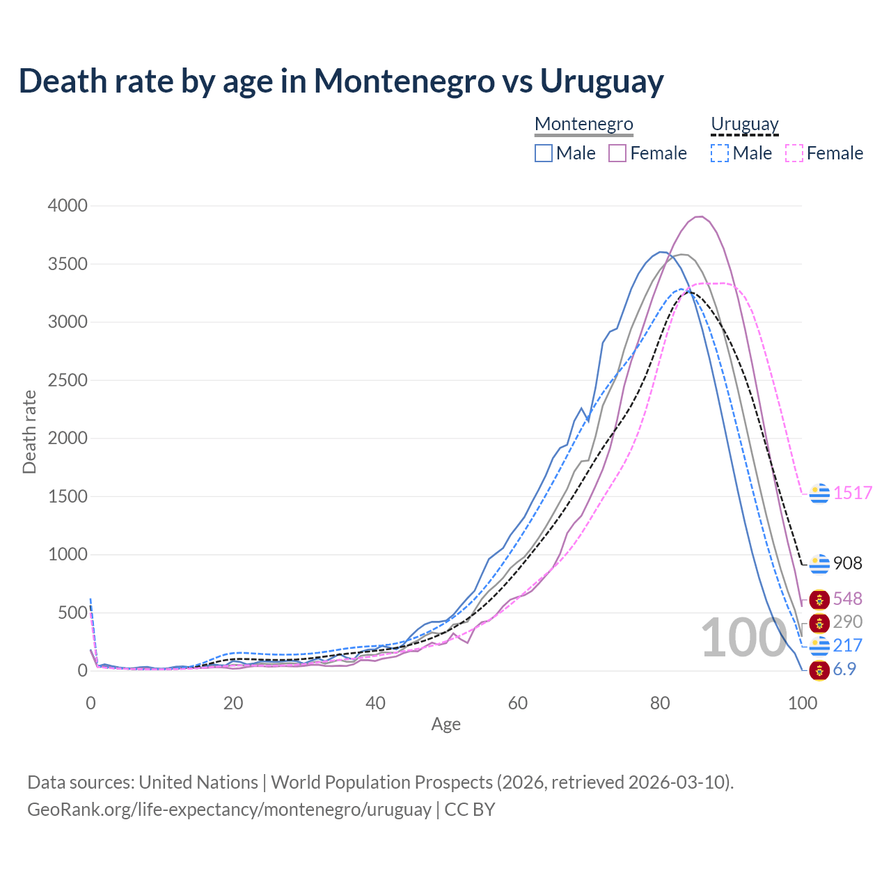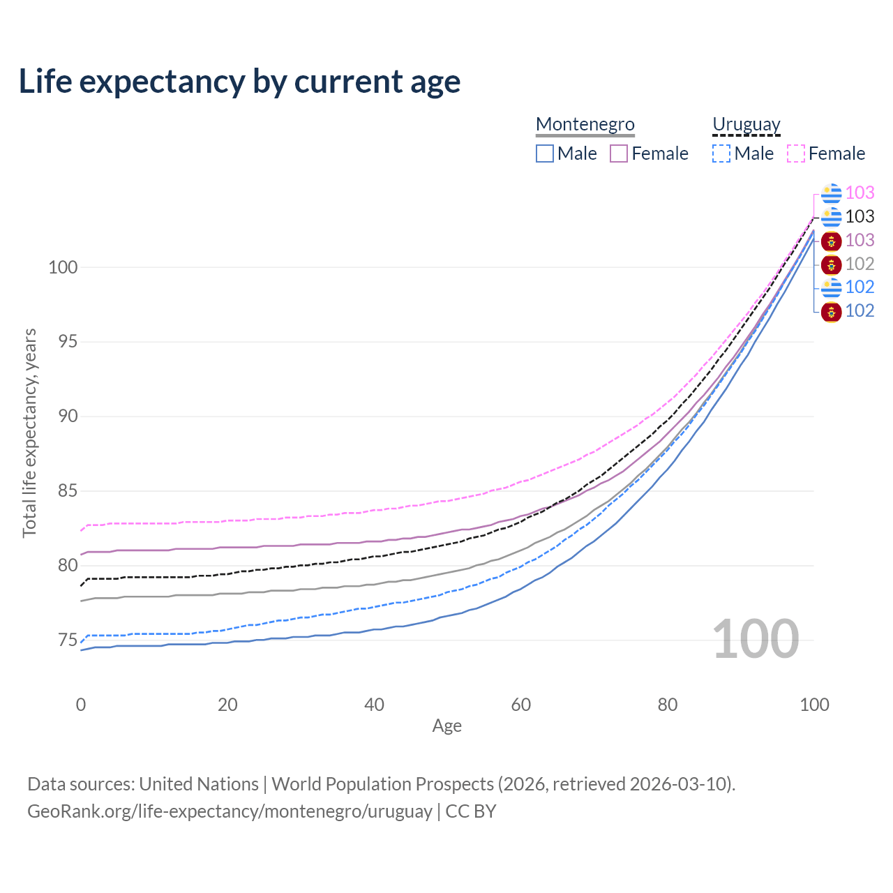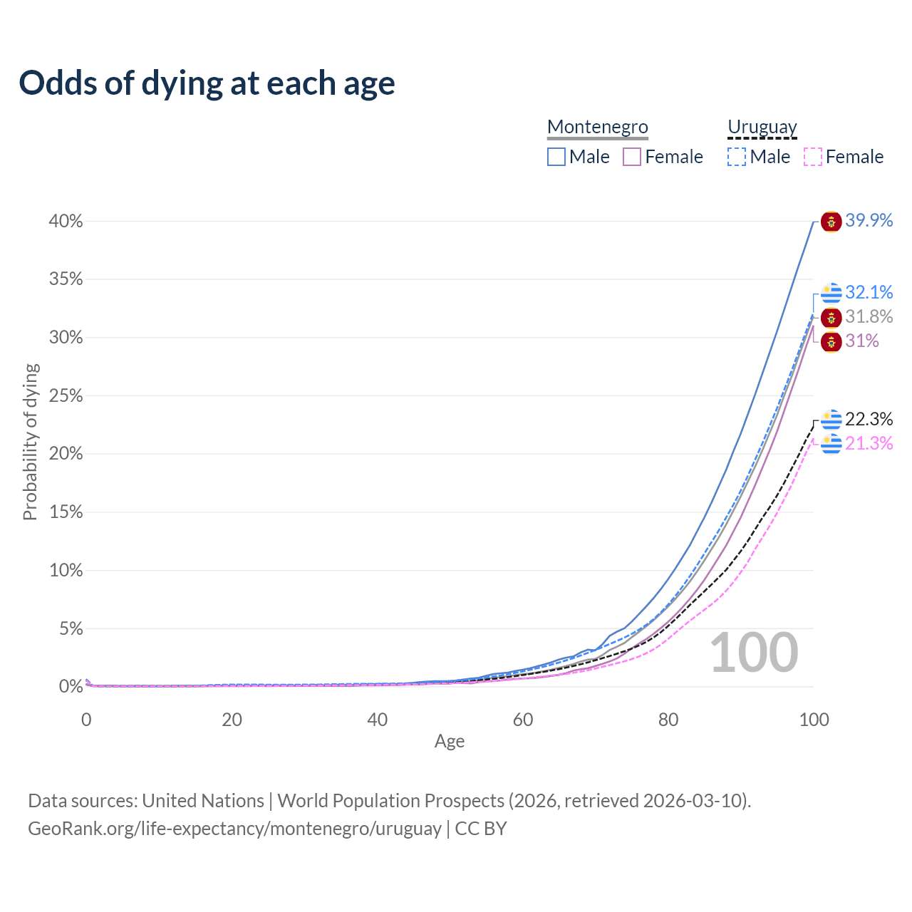 This life expectancy calculator shows the odds of living to 100, 95, 90, and below based on current age for both males and females in Montenegro and Uruguay, along with mean and median age of death. The calculations are based on the 2026 life tables (actuarial tables) from the UN World Population Prospects.