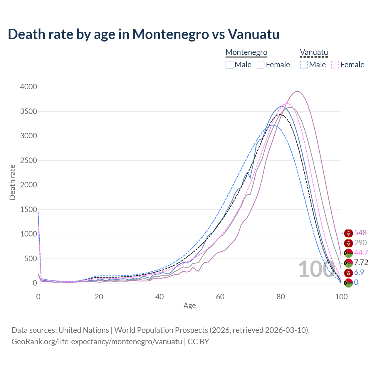 This life expectancy calculator shows the odds of living to 100, 95, 90, and below based on current age for both males and females in Montenegro and Vanuatu, along with mean and median age of death. The calculations are based on the 2026 life tables (actuarial tables) from the UN World Population Prospects.