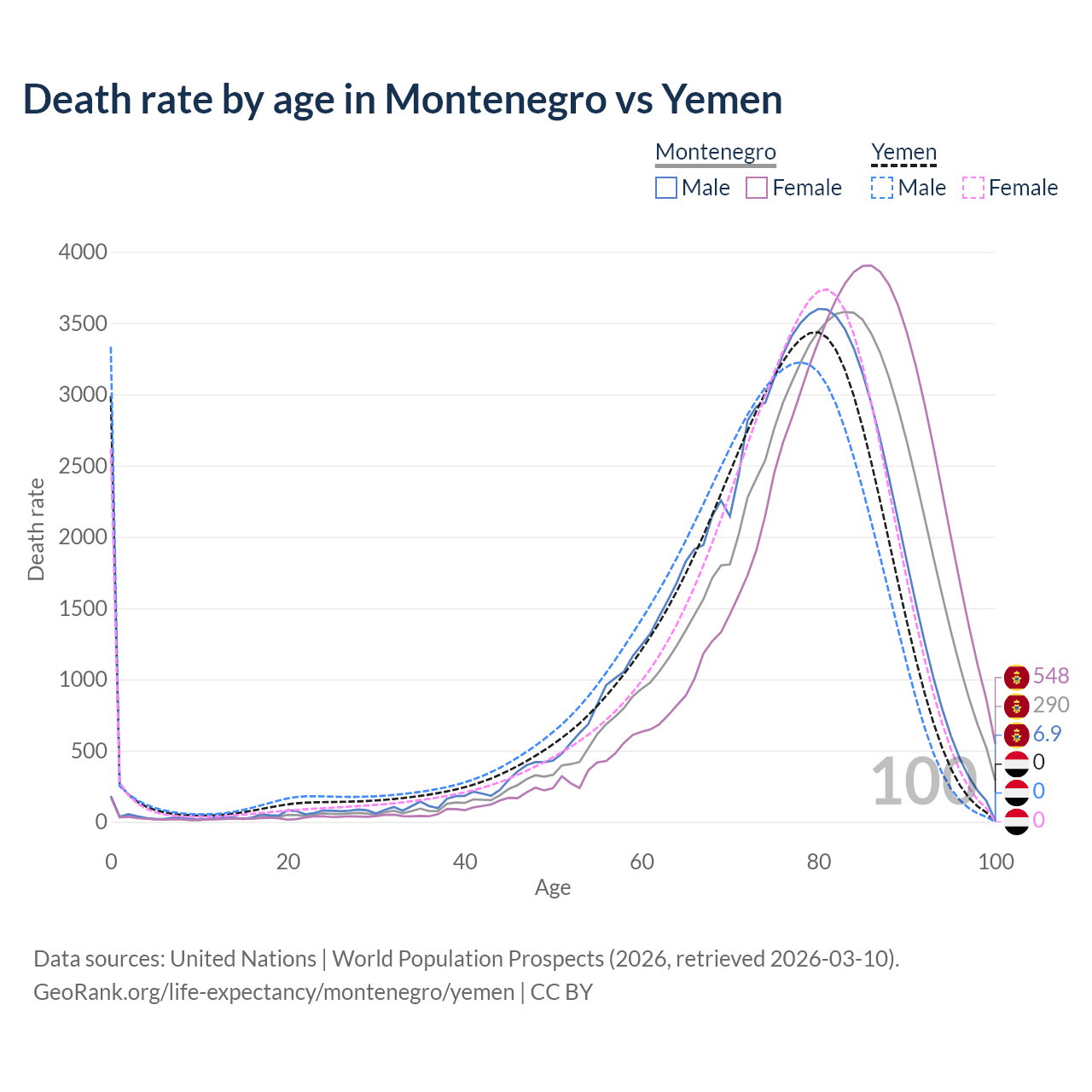 This life expectancy calculator shows the odds of living to 100, 95, 90, and below based on current age for both males and females in Montenegro and Yemen, along with mean and median age of death. The calculations are based on the 2026 life tables (actuarial tables) from the UN World Population Prospects.