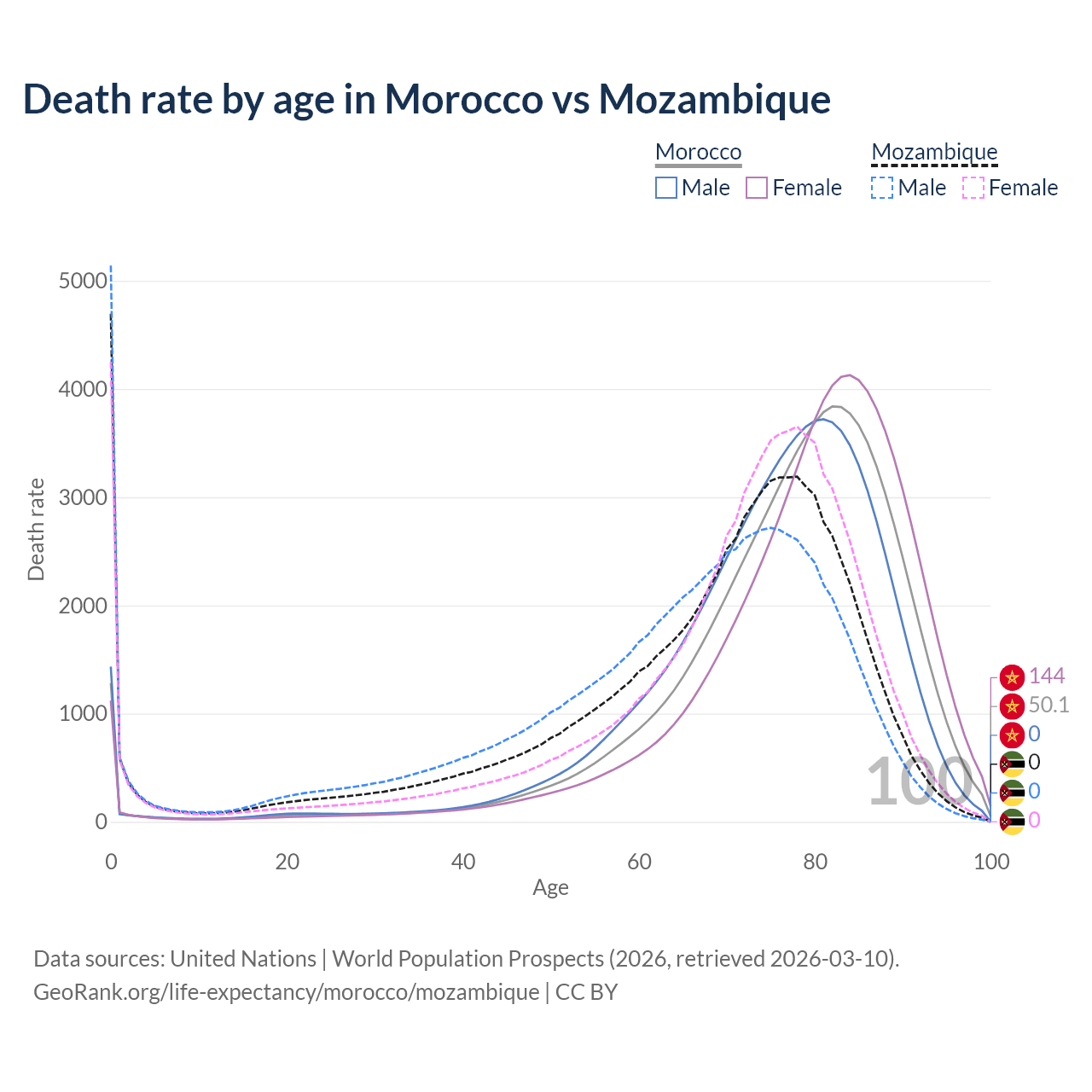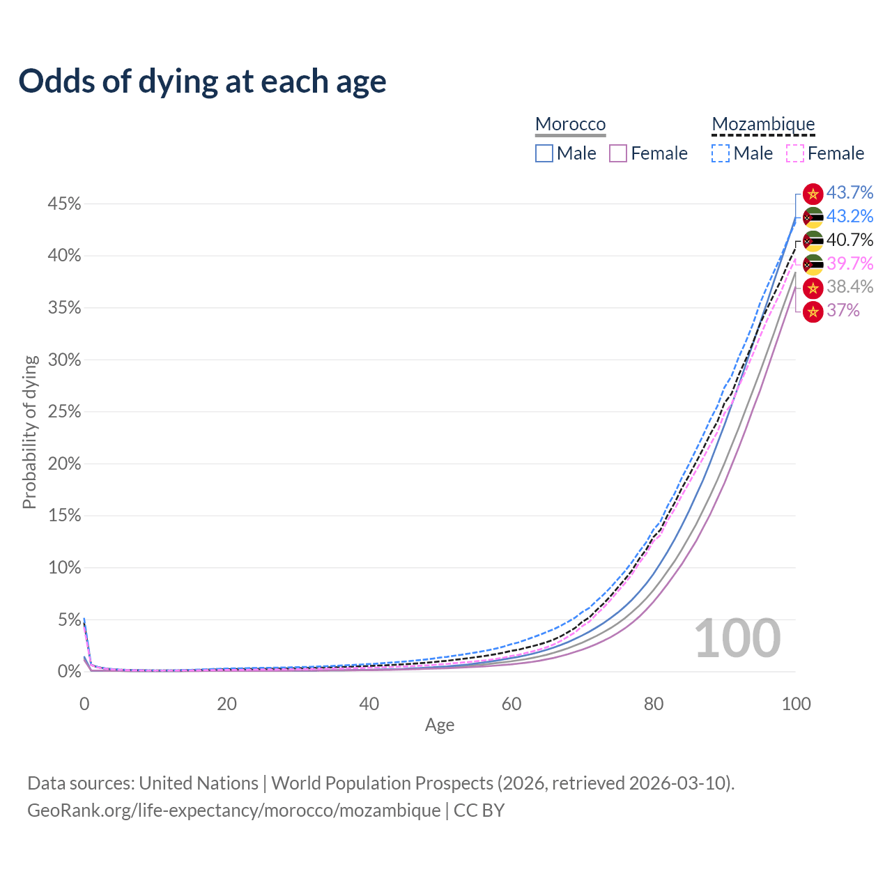 This life expectancy calculator shows the odds of living to 100, 95, 90, and below based on current age for both males and females in Morocco and Mozambique, along with mean and median age of death. The calculations are based on the 2026 life tables (actuarial tables) from the UN World Population Prospects.