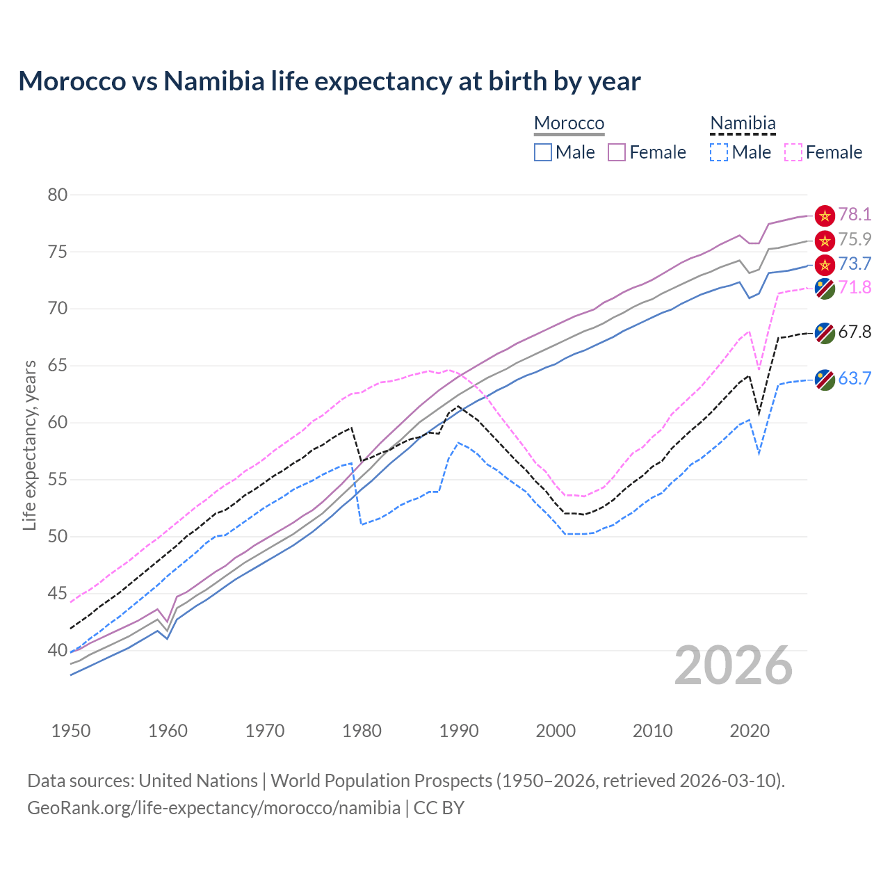 The average life expectancy at birth is 75.9 years in Morocco vs 67.8 in Namibia. Morocco is ranked 85/197 by life expectancy, and Namibia is 153/197. In Morocco, the life expectancy is 73.7 years for males and 78.1 years for females. In Namibia, it's 63.7 years for males and 71.8 years for females.