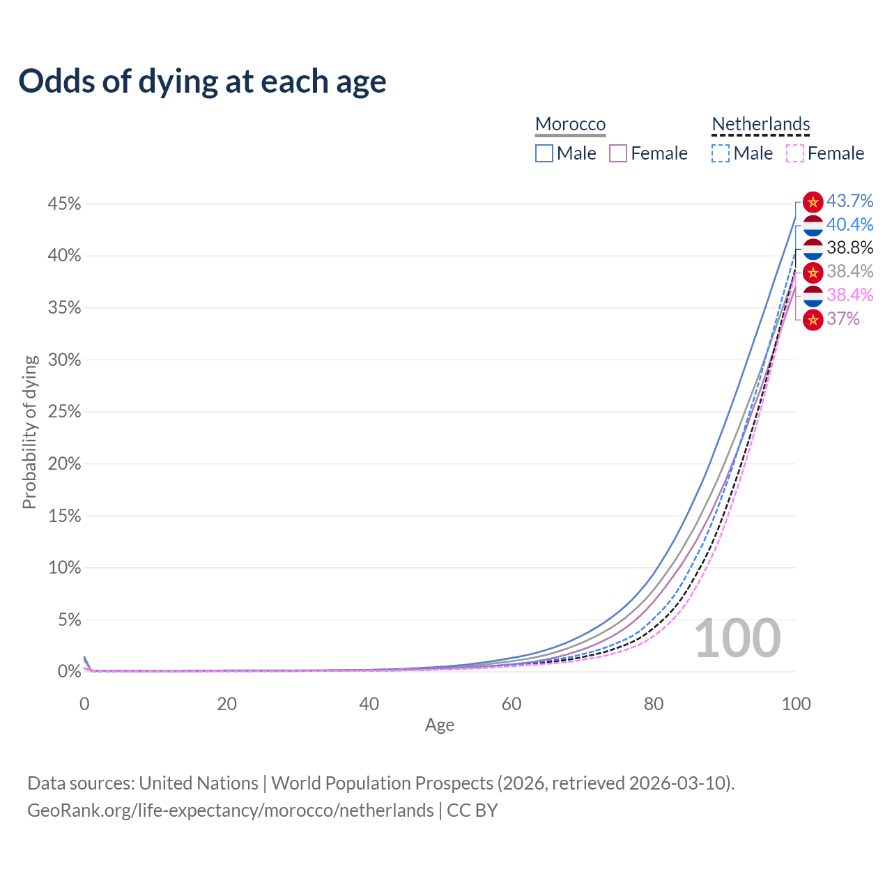 This life expectancy calculator shows the odds of living to 100, 95, 90, and below based on current age for both males and females in Morocco and the Netherlands, along with mean and median age of death. The calculations are based on the 2026 life tables (actuarial tables) from the UN World Population Prospects.