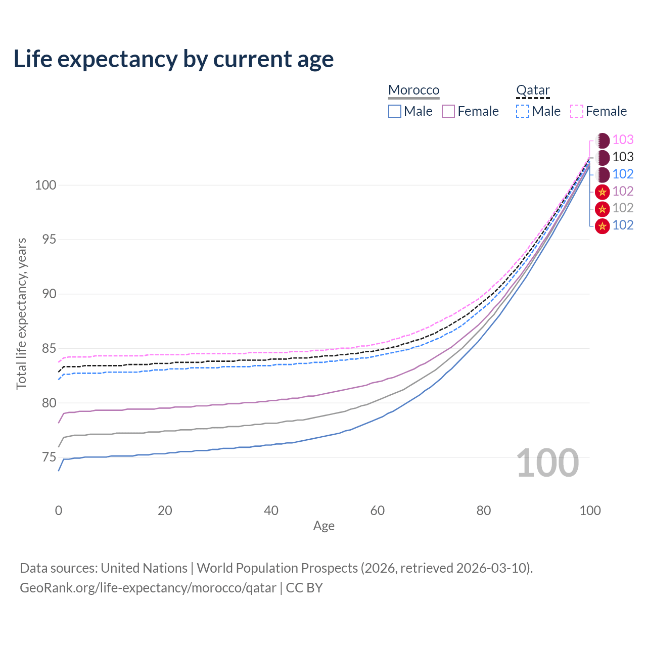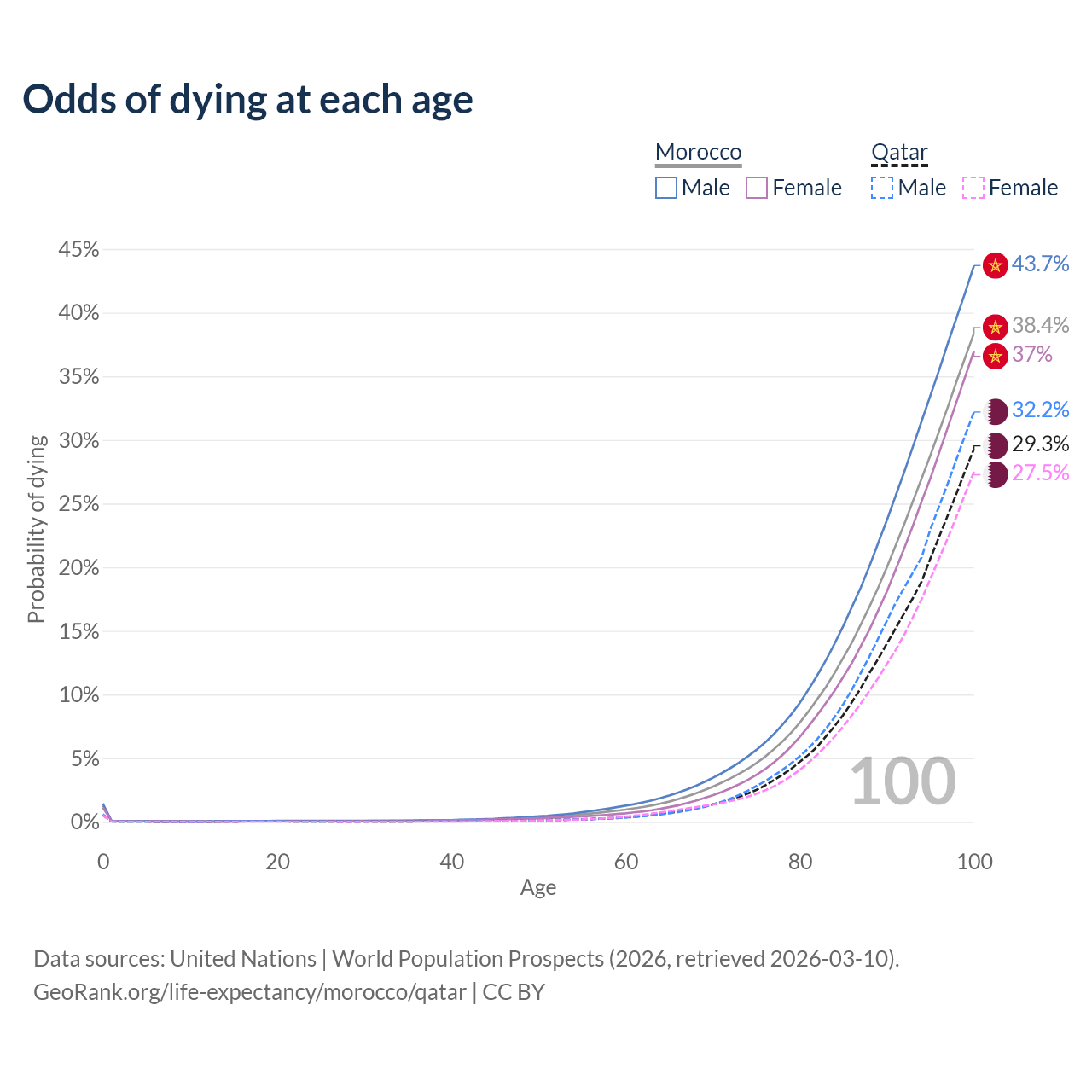 This life expectancy calculator shows the odds of living to 100, 95, 90, and below based on current age for both males and females in Morocco and Qatar, along with mean and median age of death. The calculations are based on the 2026 life tables (actuarial tables) from the UN World Population Prospects.