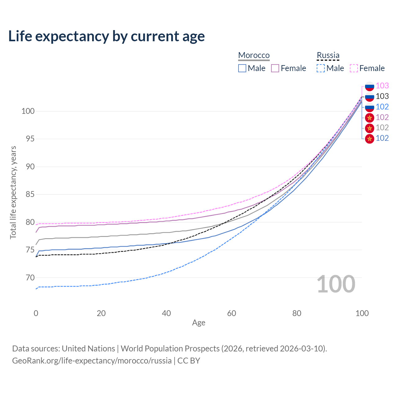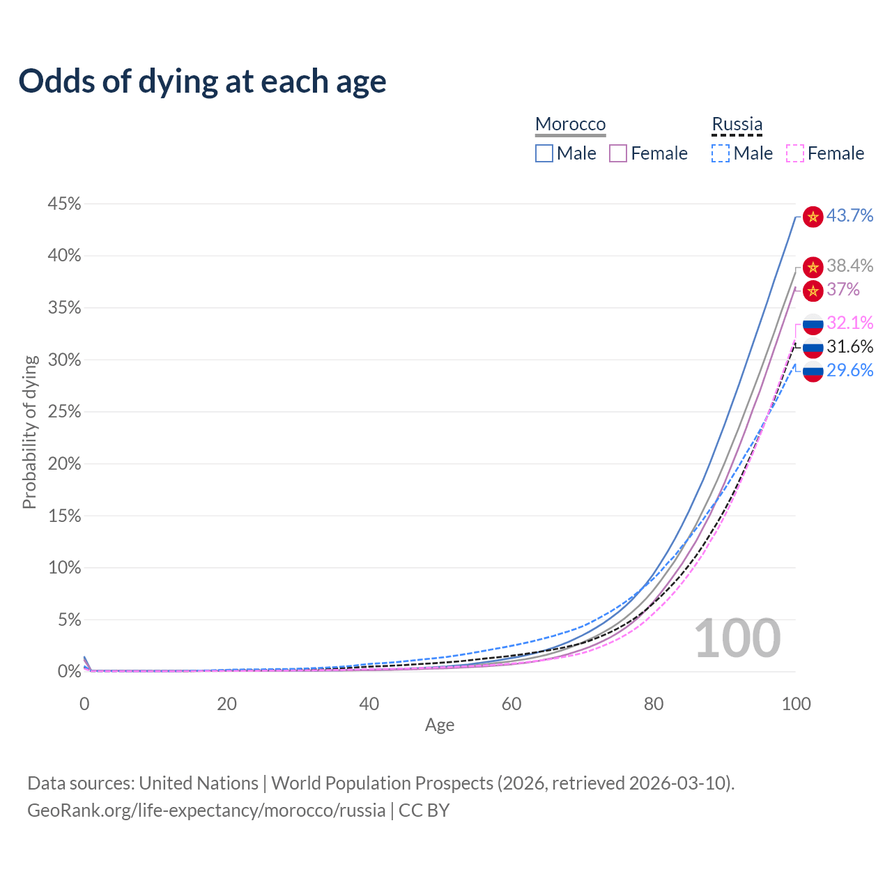 This life expectancy calculator shows the odds of living to 100, 95, 90, and below based on current age for both males and females in Morocco and Russia, along with mean and median age of death. The calculations are based on the 2026 life tables (actuarial tables) from the UN World Population Prospects.