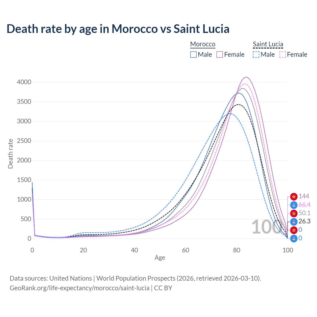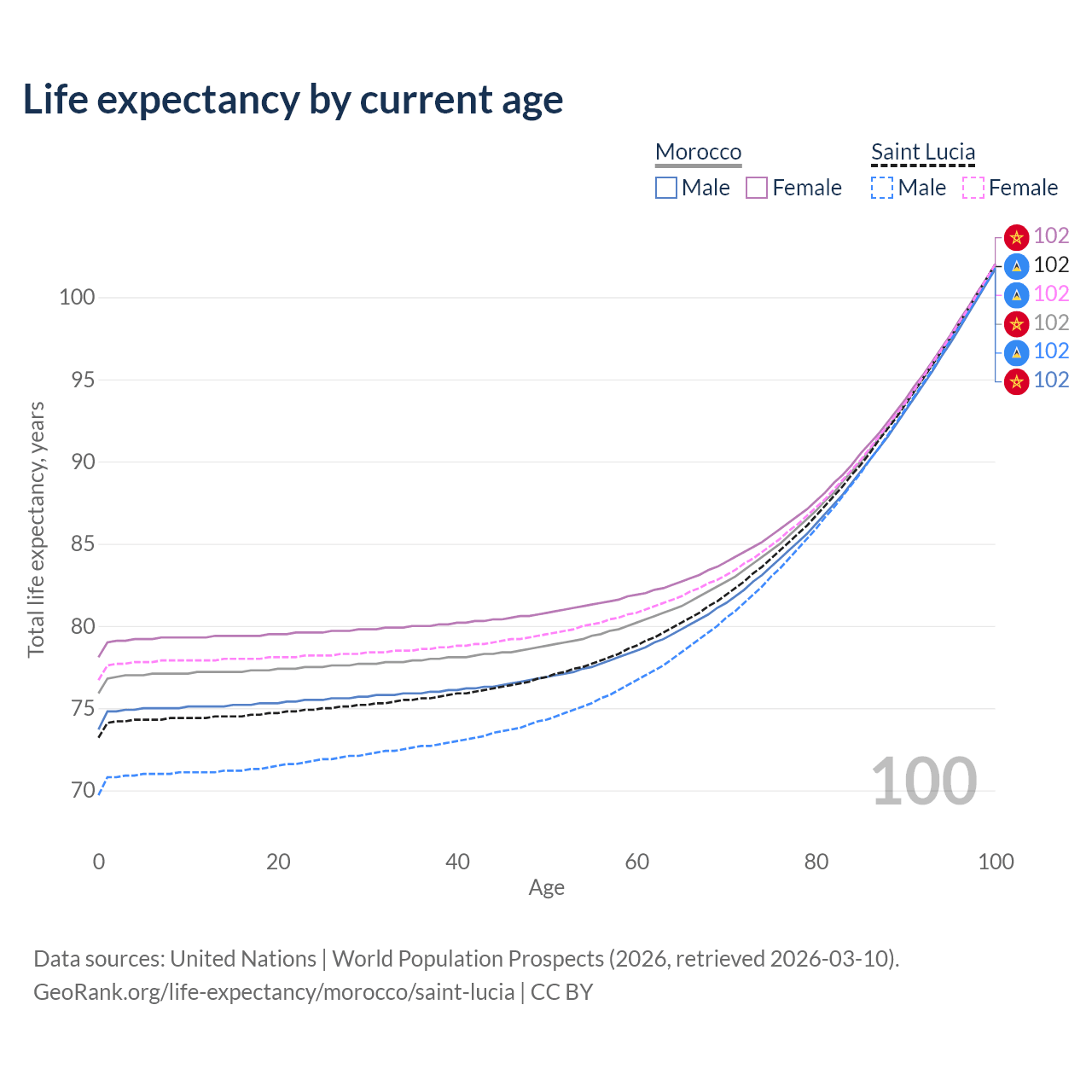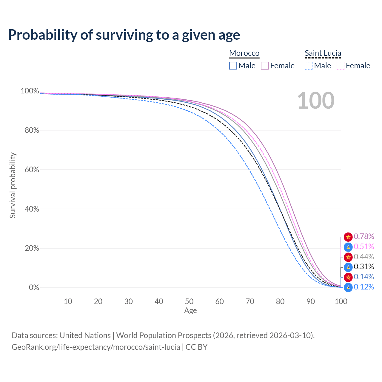 This life expectancy calculator shows the odds of living to 100, 95, 90, and below based on current age for both males and females in Morocco and Saint Lucia, along with mean and median age of death. The calculations are based on the 2026 life tables (actuarial tables) from the UN World Population Prospects.