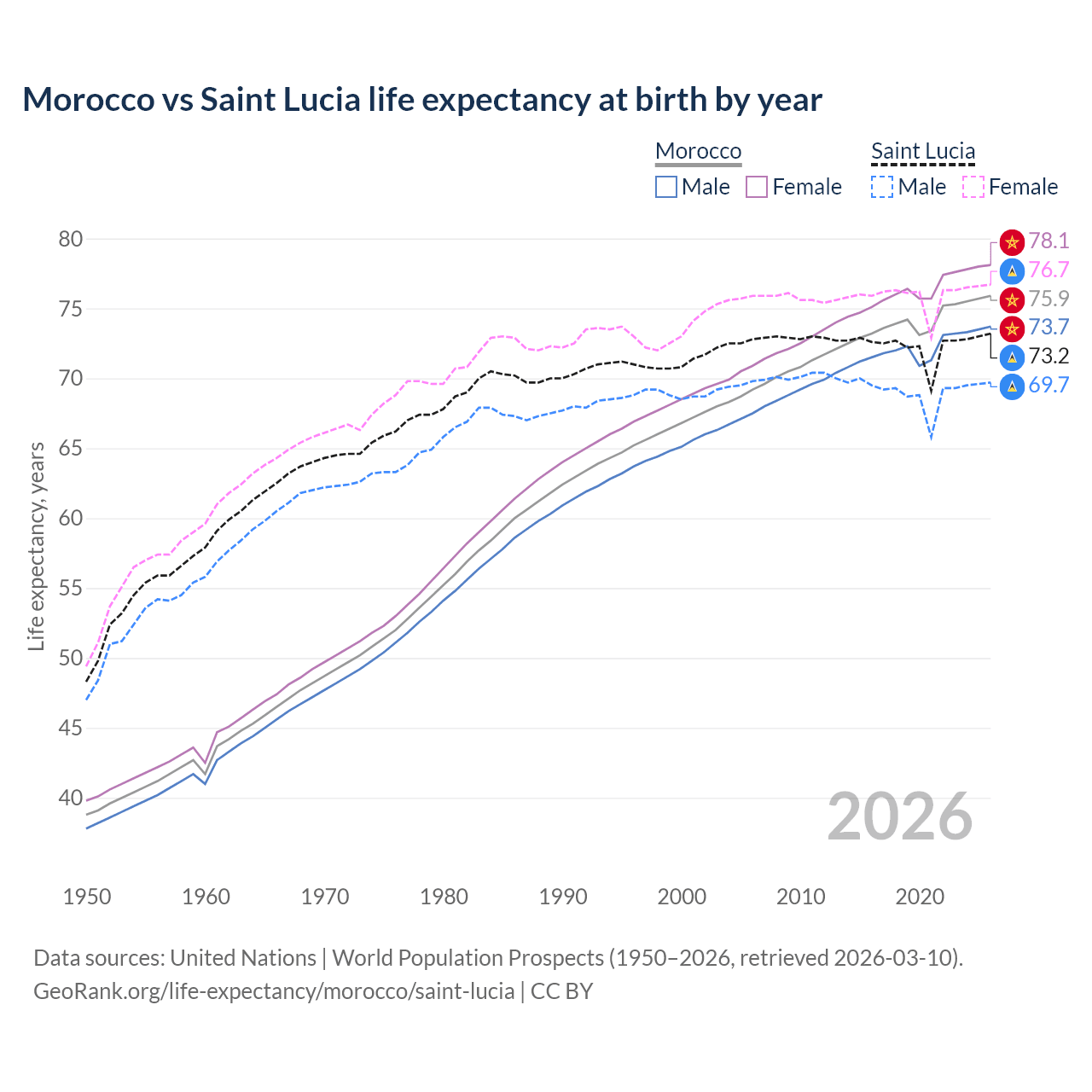 GeoRank.org/life-expectancy/morocco/saint-lucia | CC BY