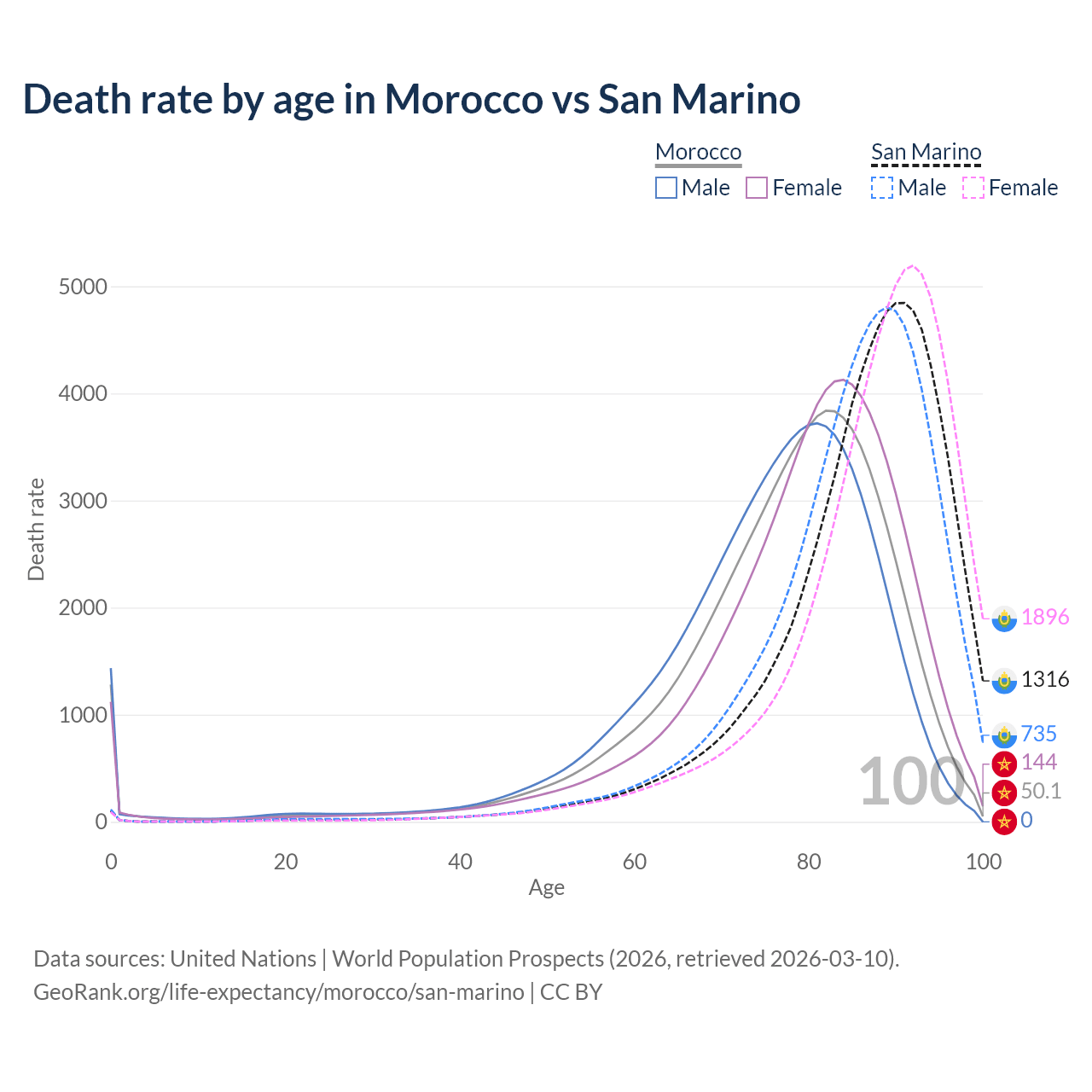 In Morocco, the most common age of death is 82, compared to 91 in San Marino. The median age of death is 79.3 in Morocco and 88.3 in San Marino, meaning only half of each cohort is expected to live past that age.
