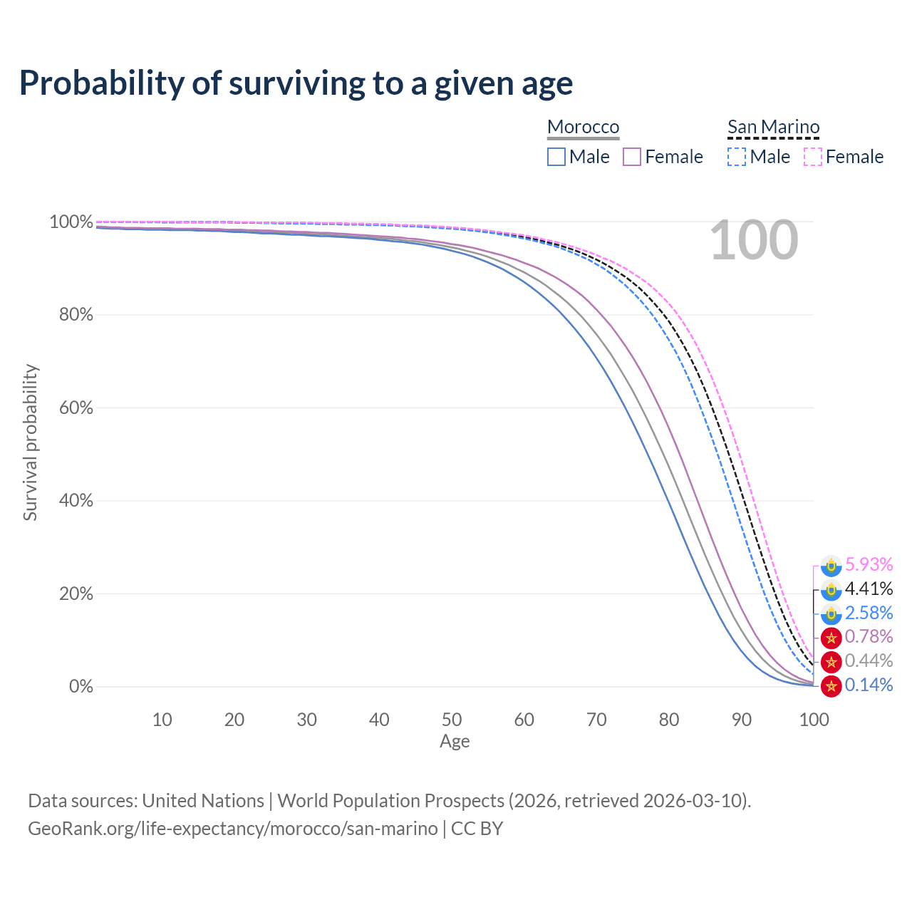 This life expectancy calculator shows the odds of living to 100, 95, 90, and below based on current age for both males and females in Morocco and San Marino, along with mean and median age of death. The calculations are based on the 2026 life tables (actuarial tables) from the UN World Population Prospects.