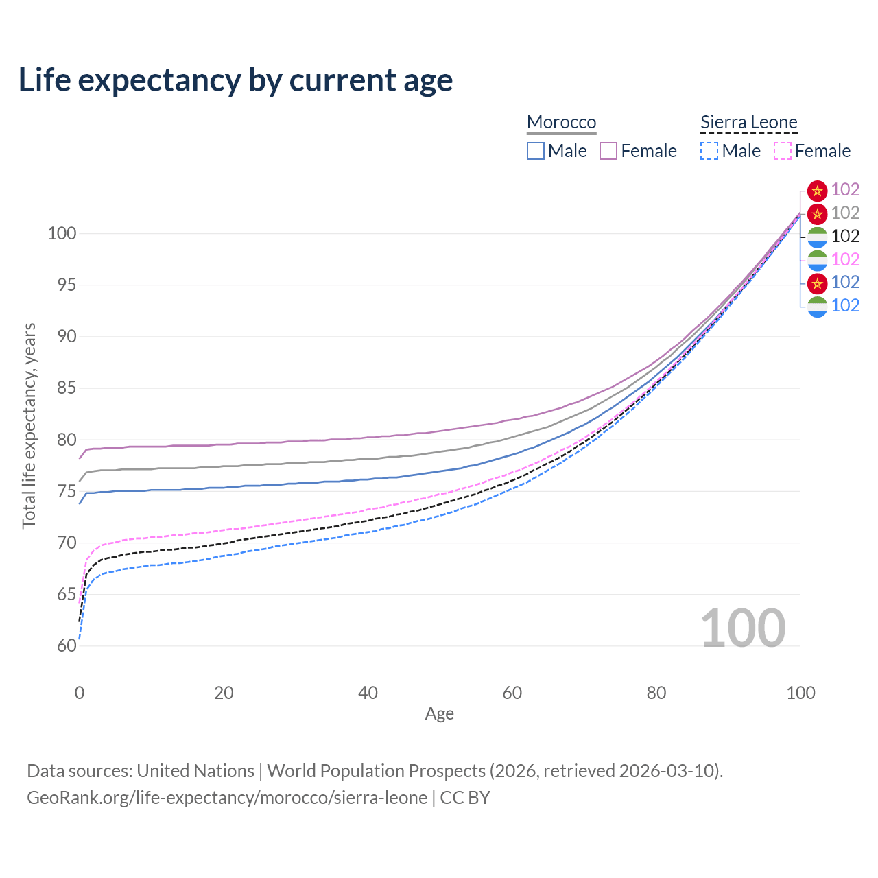 This life expectancy calculator shows the odds of living to 100, 95, 90, and below based on current age for both males and females in Morocco and Sierra Leone, along with mean and median age of death. The calculations are based on the 2026 life tables (actuarial tables) from the UN World Population Prospects.