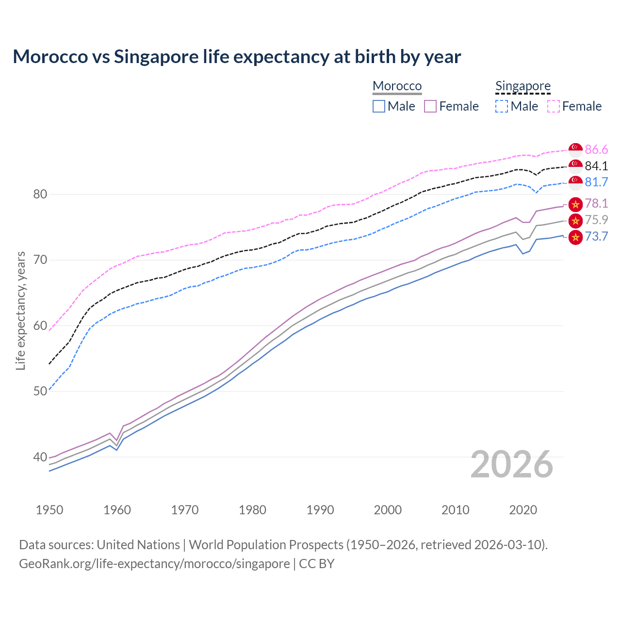 The average life expectancy at birth is 75.9 years in Morocco vs 84.1 in Singapore. Morocco is ranked 85/197 by life expectancy, and Singapore is 9/197. In Morocco, the life expectancy is 73.7 years for males and 78.1 years for females. In Singapore, it's 81.7 years for males and 86.6 years for females.