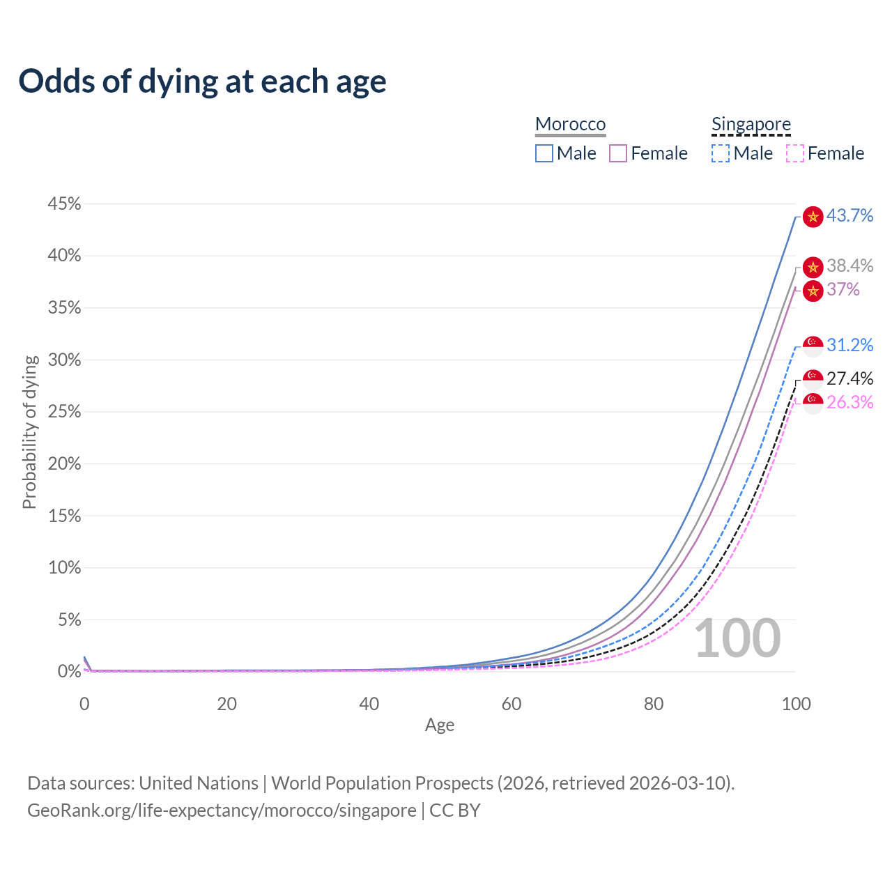 This life expectancy calculator shows the odds of living to 100, 95, 90, and below based on current age for both males and females in Morocco and Singapore, along with mean and median age of death. The calculations are based on the 2026 life tables (actuarial tables) from the UN World Population Prospects.