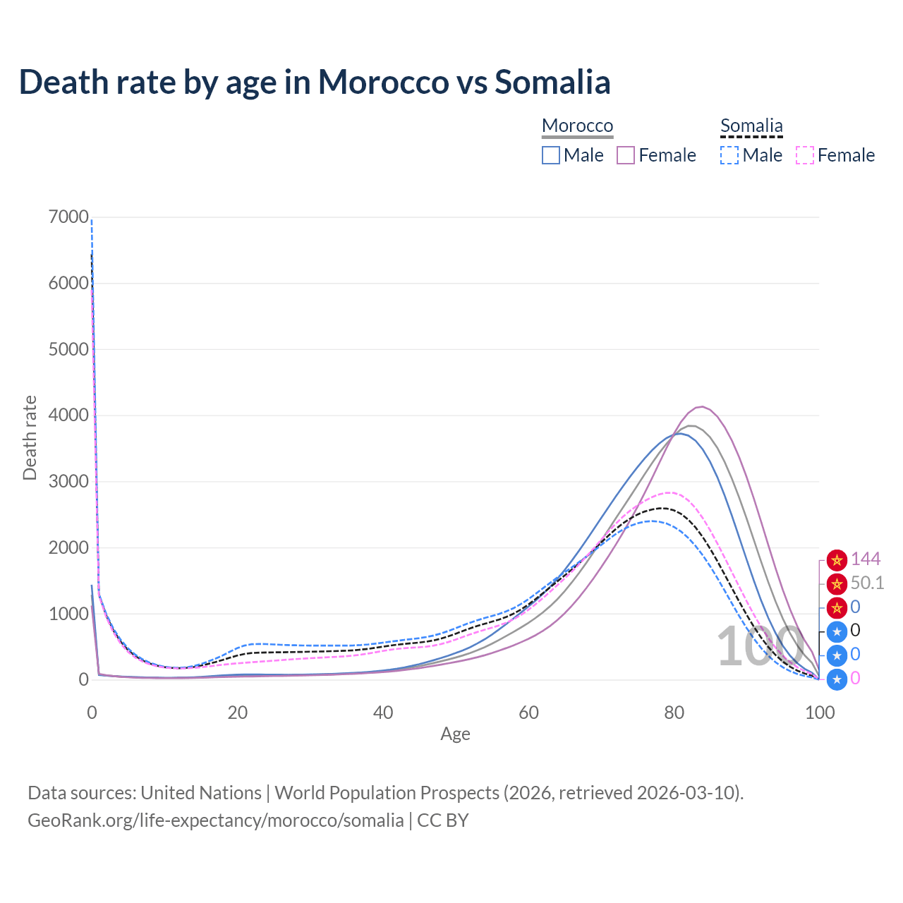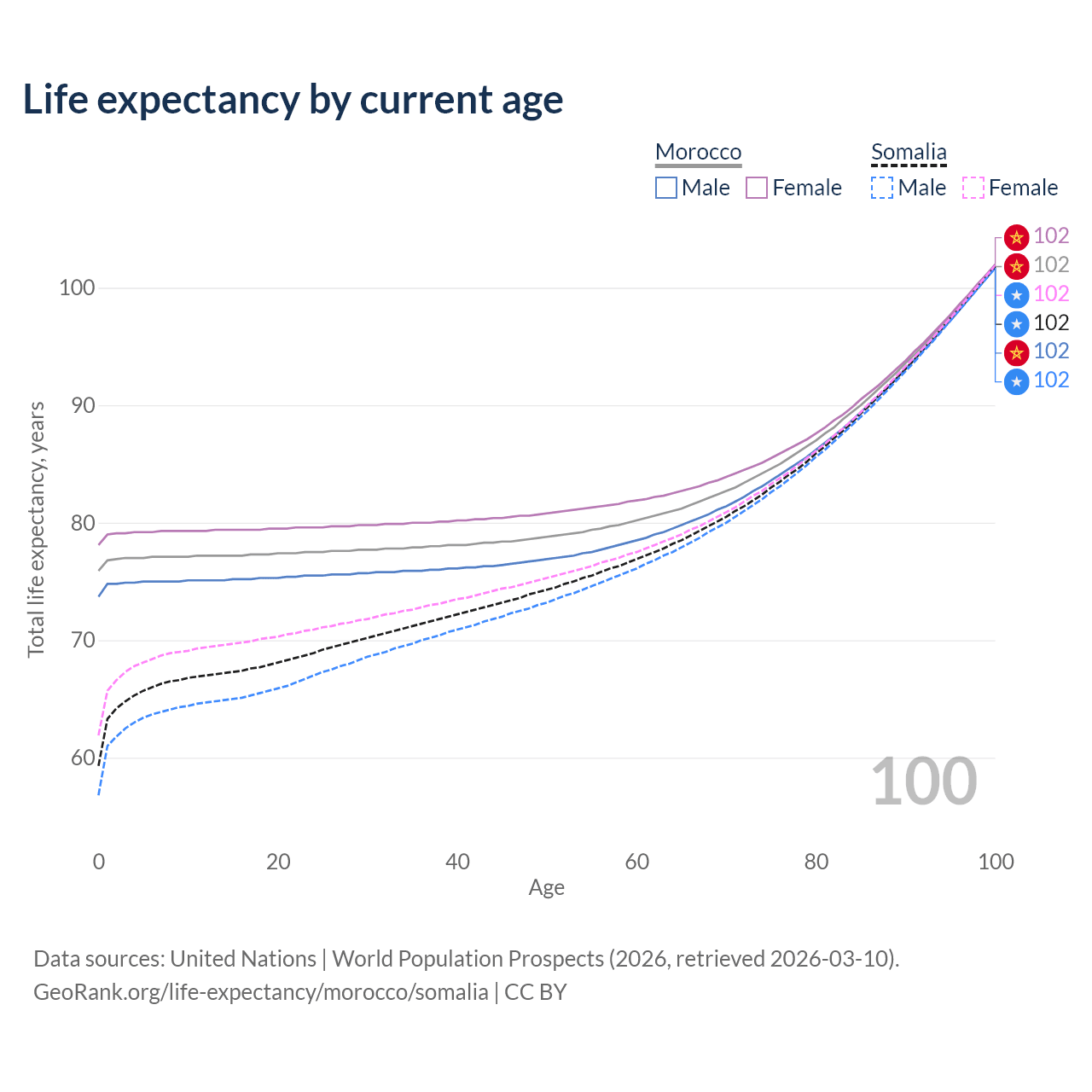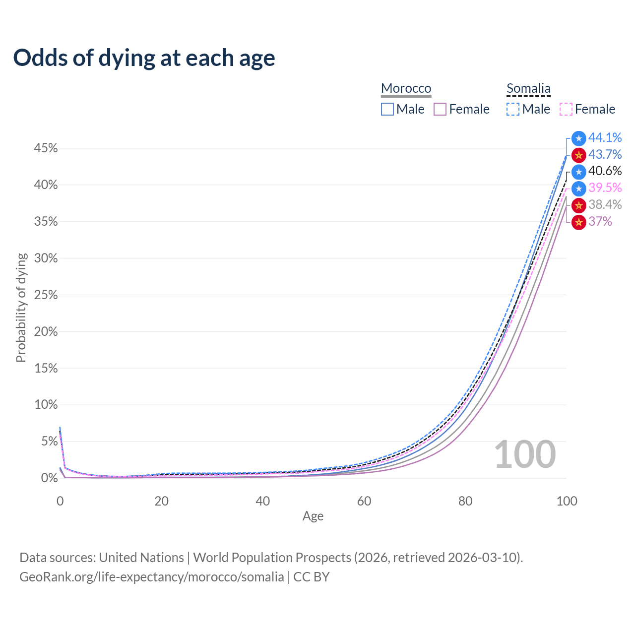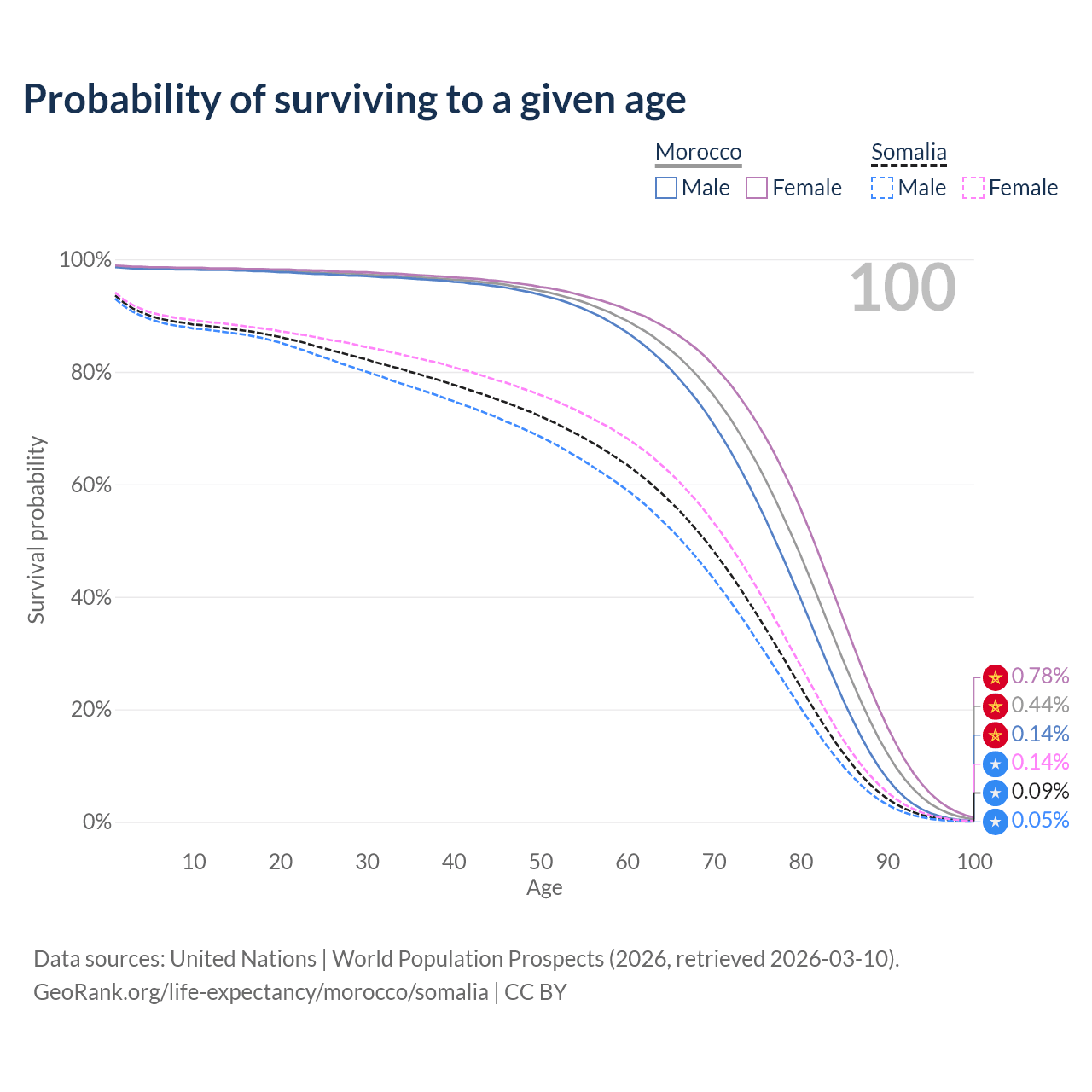 This life expectancy calculator shows the odds of living to 100, 95, 90, and below based on current age for both males and females in Morocco and Somalia, along with mean and median age of death. The calculations are based on the 2026 life tables (actuarial tables) from the UN World Population Prospects.